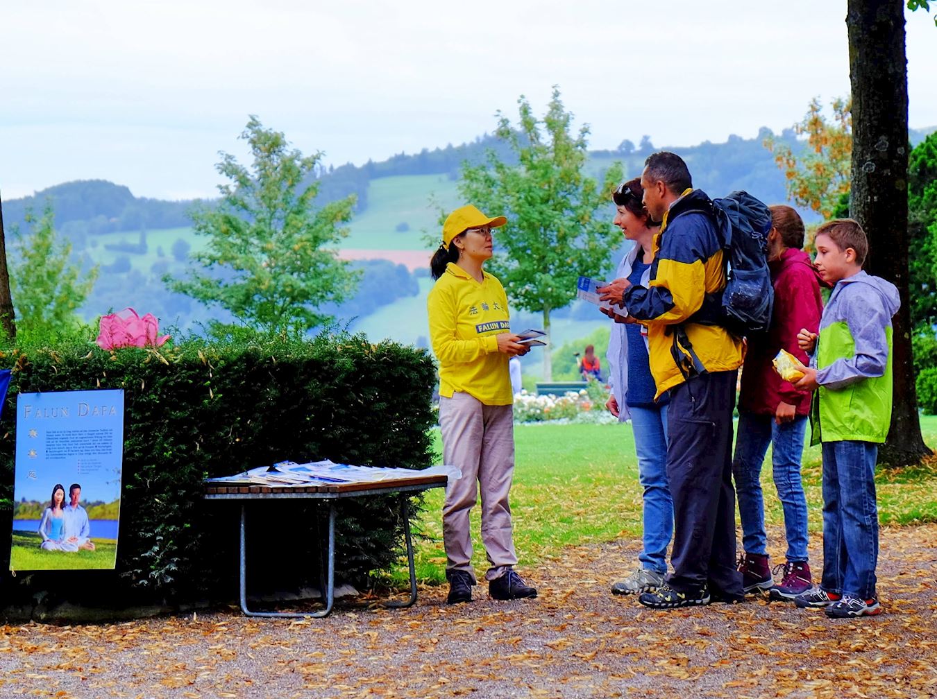 图2:部份瑞士法轮功学员在伯尔尼景点玫瑰园(Rosen Garten)炼功,向游客传播法轮功的真相,不少游客驻足了解。