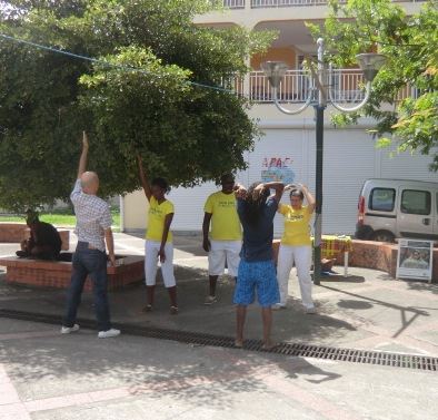 ![]() 图3:在格朗布尔市集市上演示法轮功功法和教功 |