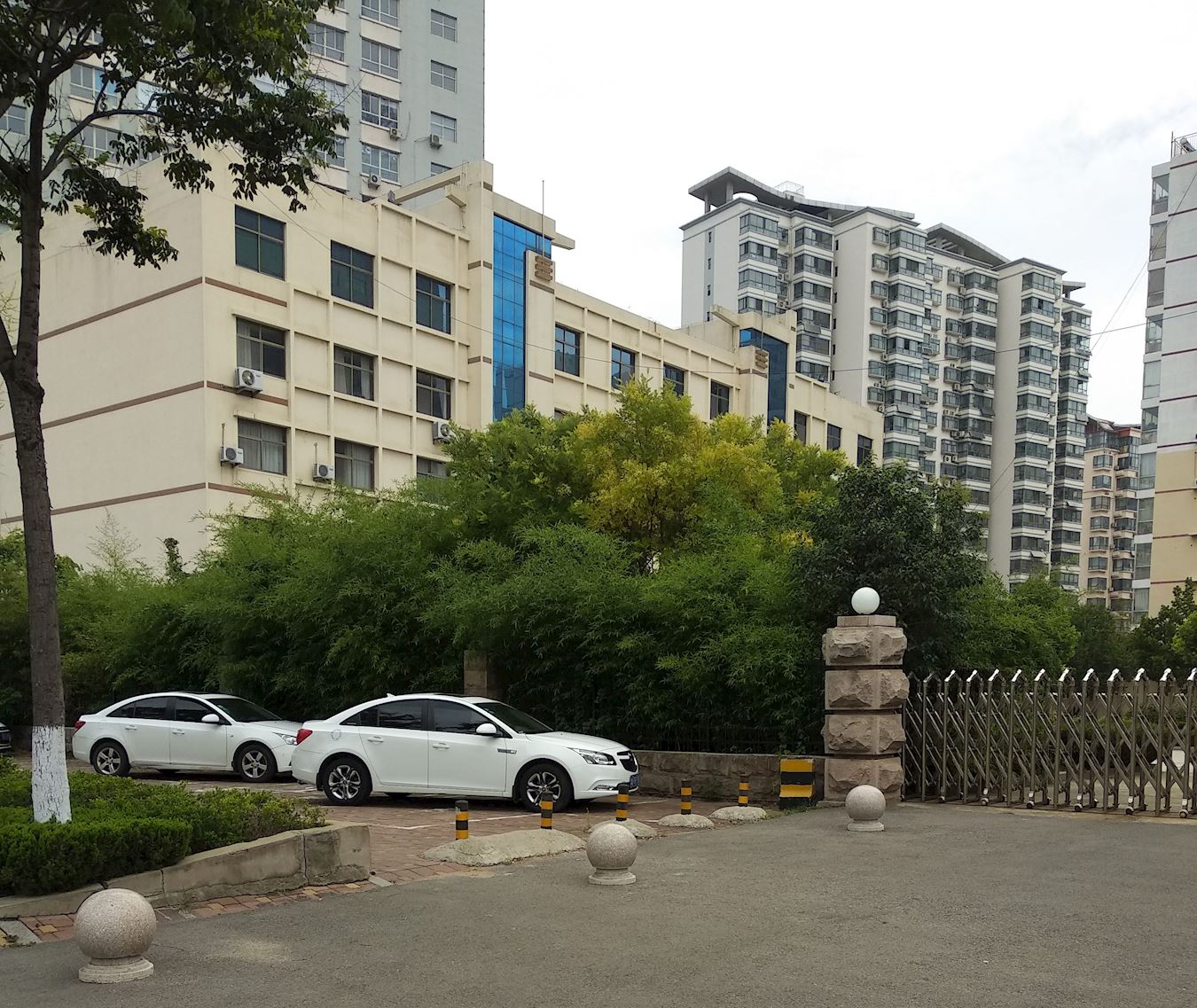 '图2:图中黄色的楼是洗脑班的背面。图中的大门不是洗脑班的大门,而是一个小区的大门。'