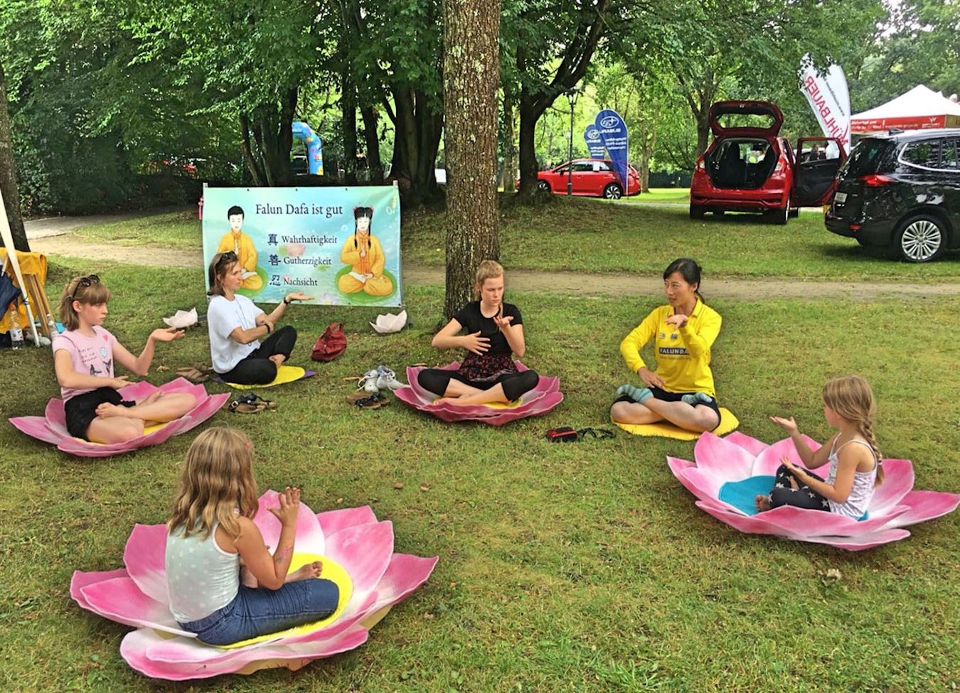 ![]() 图1:二零一八年七月二十二日,德国巴特克茨廷法轮功学员应邀参加巴伐利亚中部报社(Mittelbayerische Zeitung) 该市疗养公园(Kurpark)举办的儿童节,为孩子和家长提供免费教功。 |