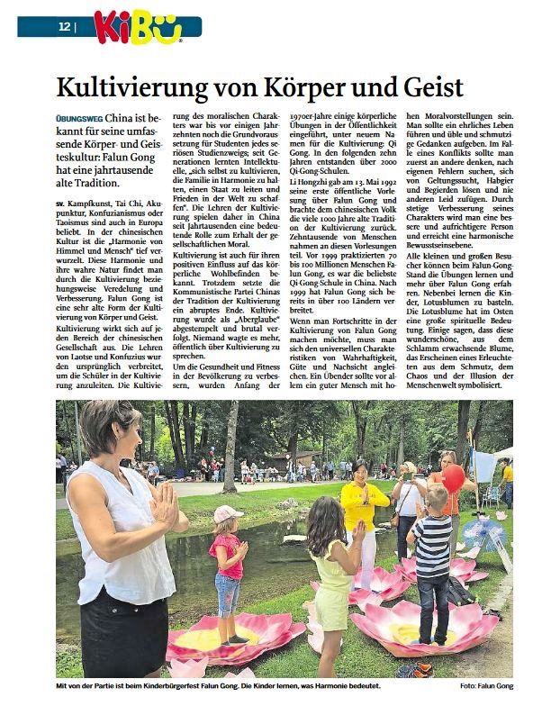 巴伐利亚中部报社在儿童节之前发行了副刊。其中整页详细介绍了法轮功的文化历史背景和修炼基本原理,同时刊登了去年儿童节家长和孩子一起学功的照片,并在图说上写道:“孩子学法轮功的话,会体验什么是祥和”。