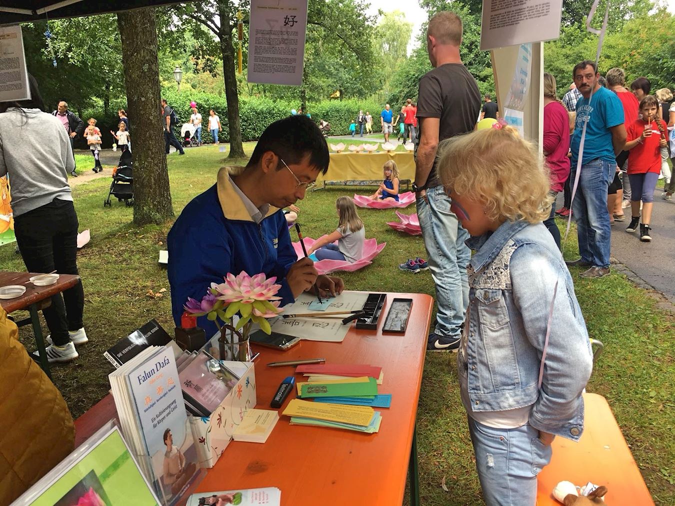 巴特克茨廷市长霍夫曼(Hofmann),路过法轮功展位时,法轮功学员向市长介绍了法轮功洪传世界,让很多人身心受益,而且学功免费;当地著名的中医院的不少病人也尝试炼法轮功,他们感到功法的能量很好。霍夫曼市长兴致勃勃地听着。随后,学员送了霍夫曼市长一朵手工做的莲花,市长惊喜地接过莲花,并读出吊挂在莲花上的书签上的三个字:“真、善、忍”。学员对霍夫曼说,身为市长、工作压力一定很大,希望法轮功能帮助他保持清晰的思想和平和的内心。