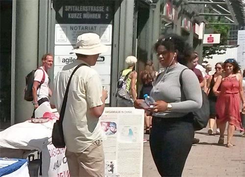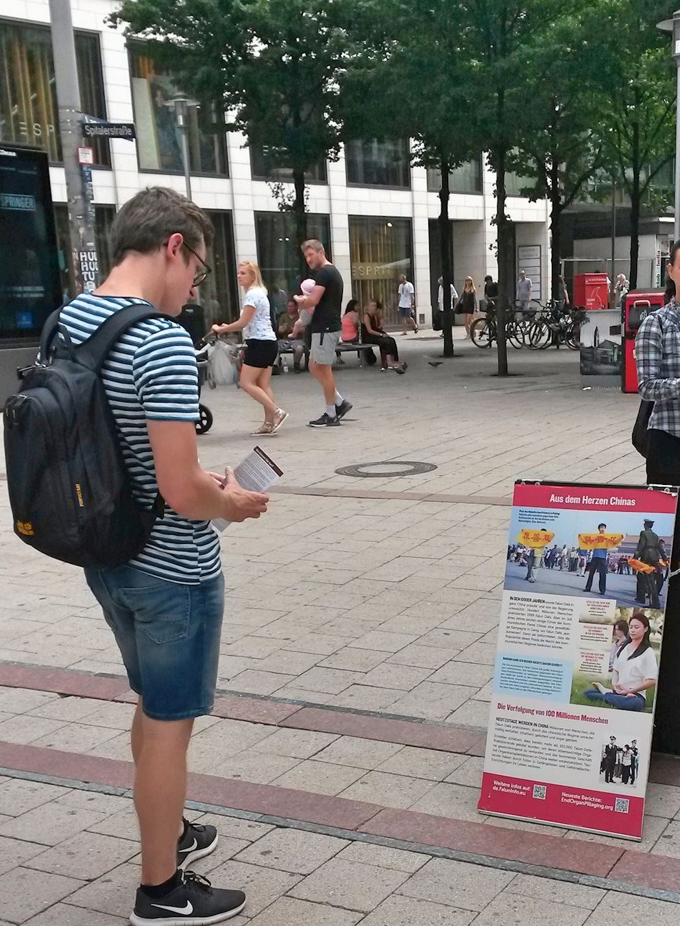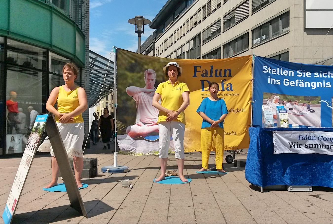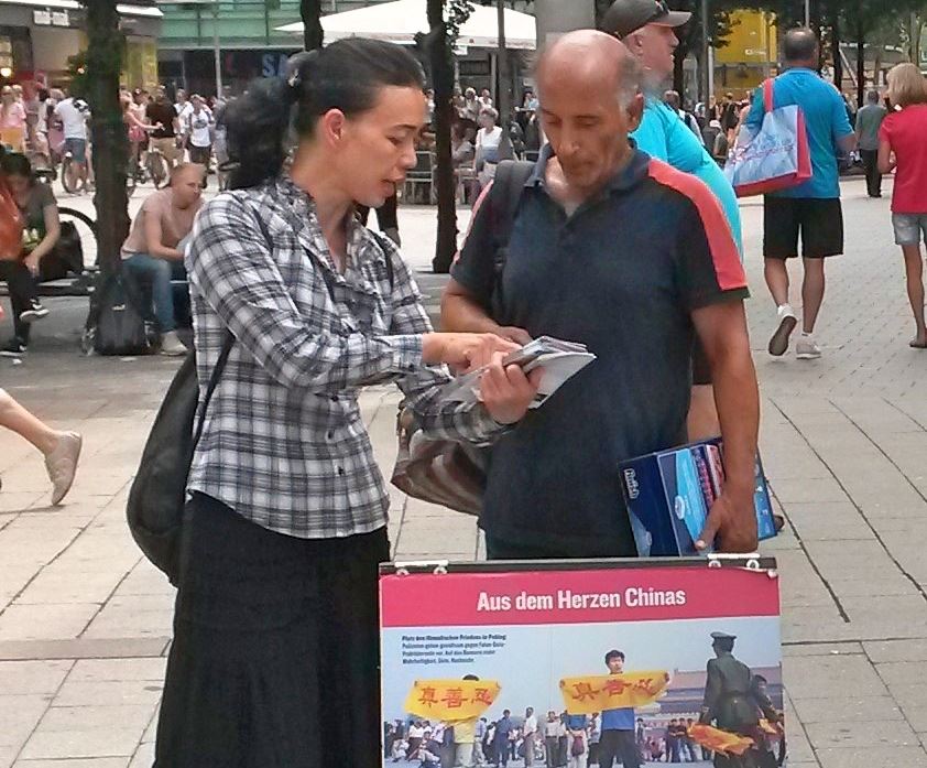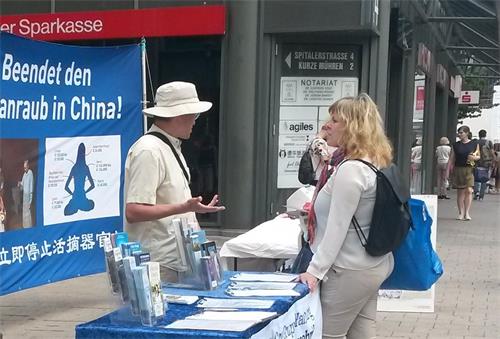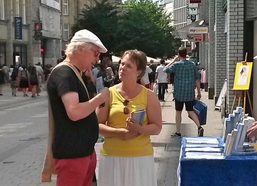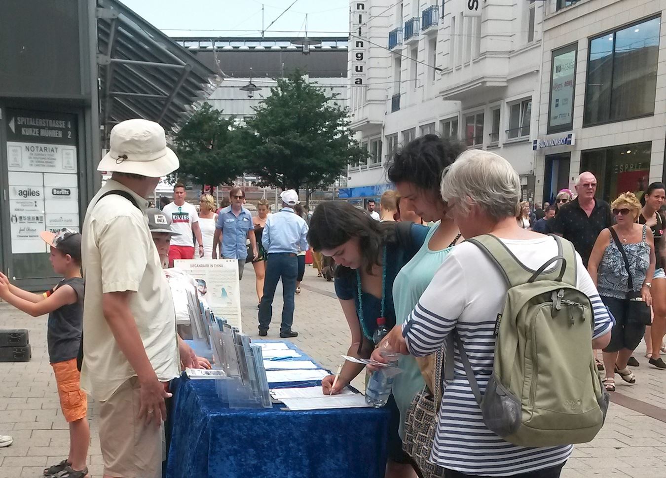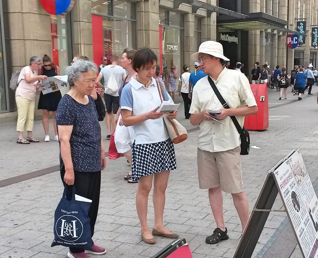 【明慧网二零一八年七月三十一日】二零一八年七月二十八日中午,法轮功学员在汉堡市中心的步行街史比塔勒街(Spitalerstrasse)上举办信息日活动,通过功法展示、信息展板和真相横幅,以及模拟活摘器官“手术台”等,告诉人们法轮功是什么,以及发生在中国、中共法轮功的真相。尽管天气炎热,许多路人还是在信息展台前停下来、了解真相。