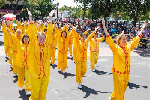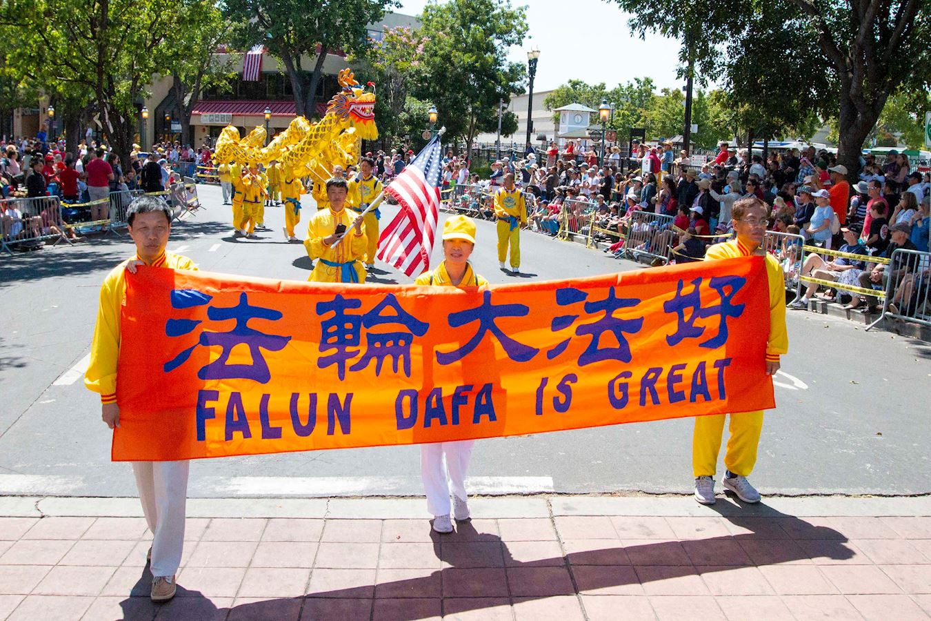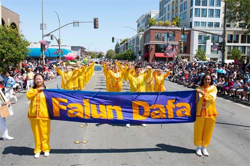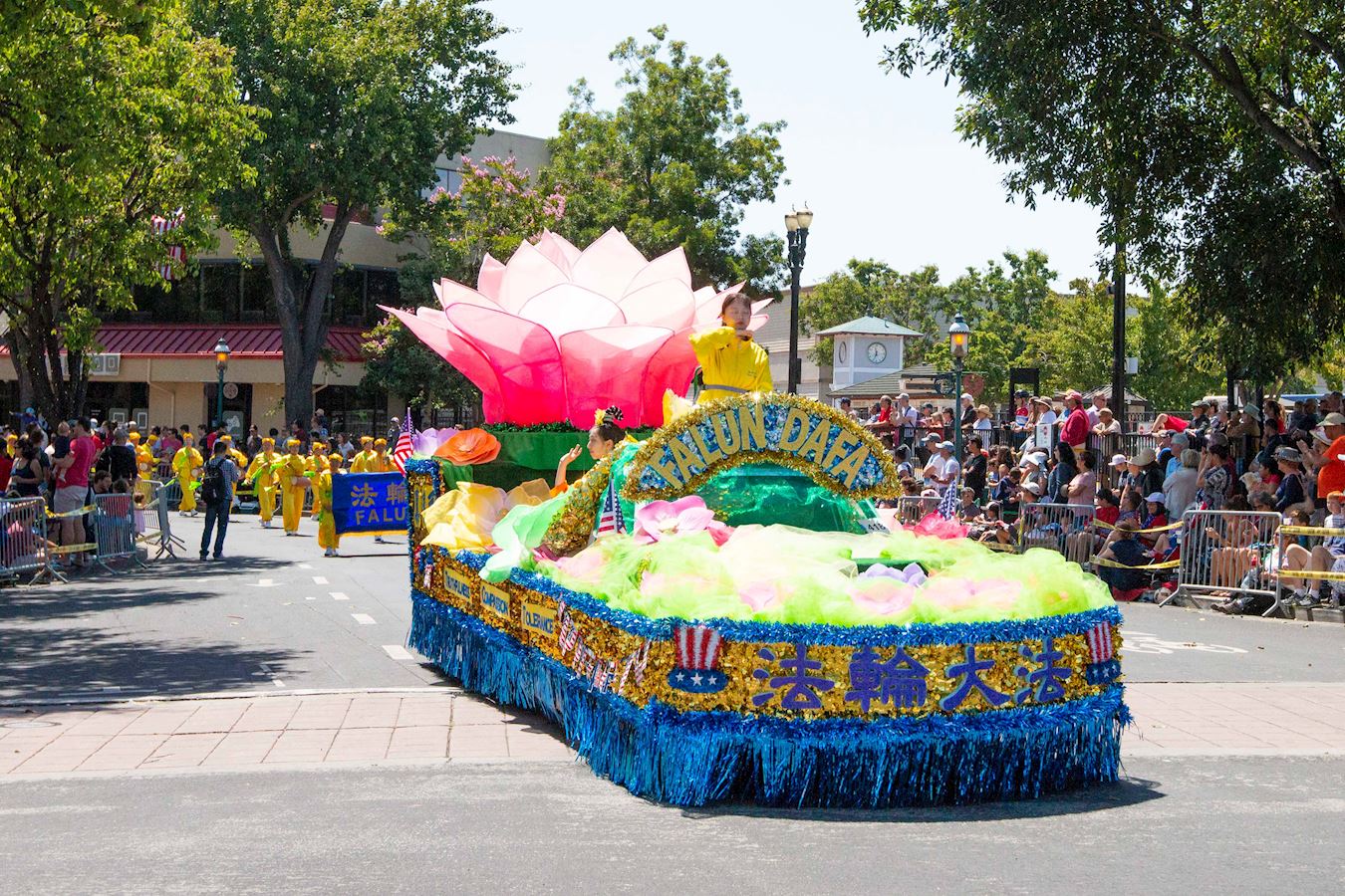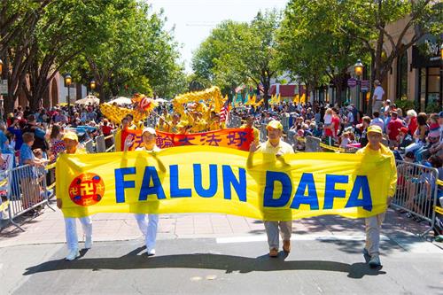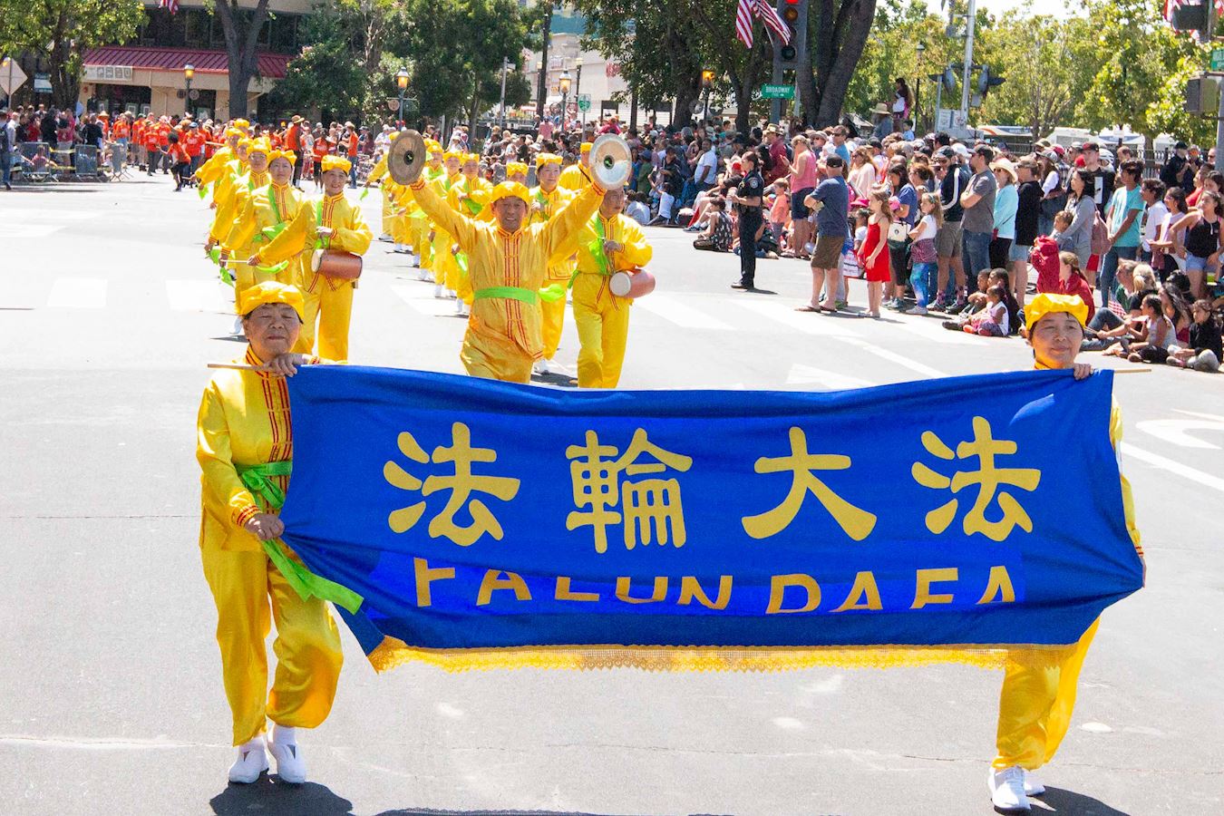 游行队伍经过主席台时,主持人向观众介绍说,现在来的队伍是法轮大法的队伍。法轮大法的原则是真、善、忍,包括打坐和缓慢的功法,在世界各地一百多个国家都有人炼法轮功,千百万的人炼功后获得了身心健康。