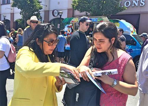 游行结束后,许多观众来到展位,进一步了解法轮功。