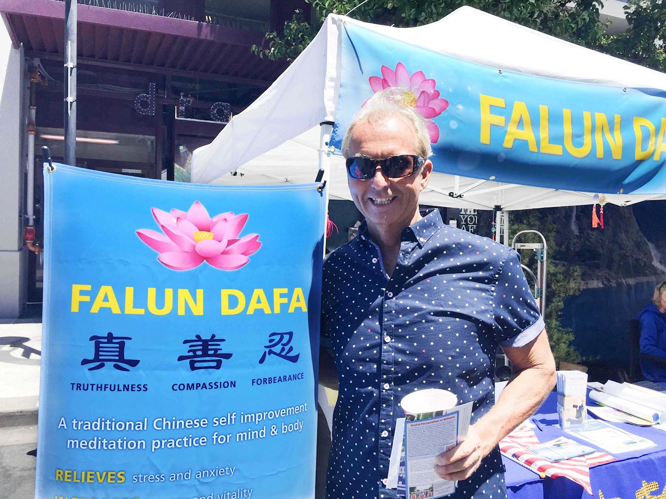 南加州大学博士弗兰克?维斯科(Frank Wasco)表示,他今天观看了法轮功学员的游行,并与学员交谈有关身心健康的重要性。“我喜欢法轮功的原则真、善、忍。我绝对会进一步了解法轮功,上网查询相关资料,希望能有机会参加法轮功教功班。”