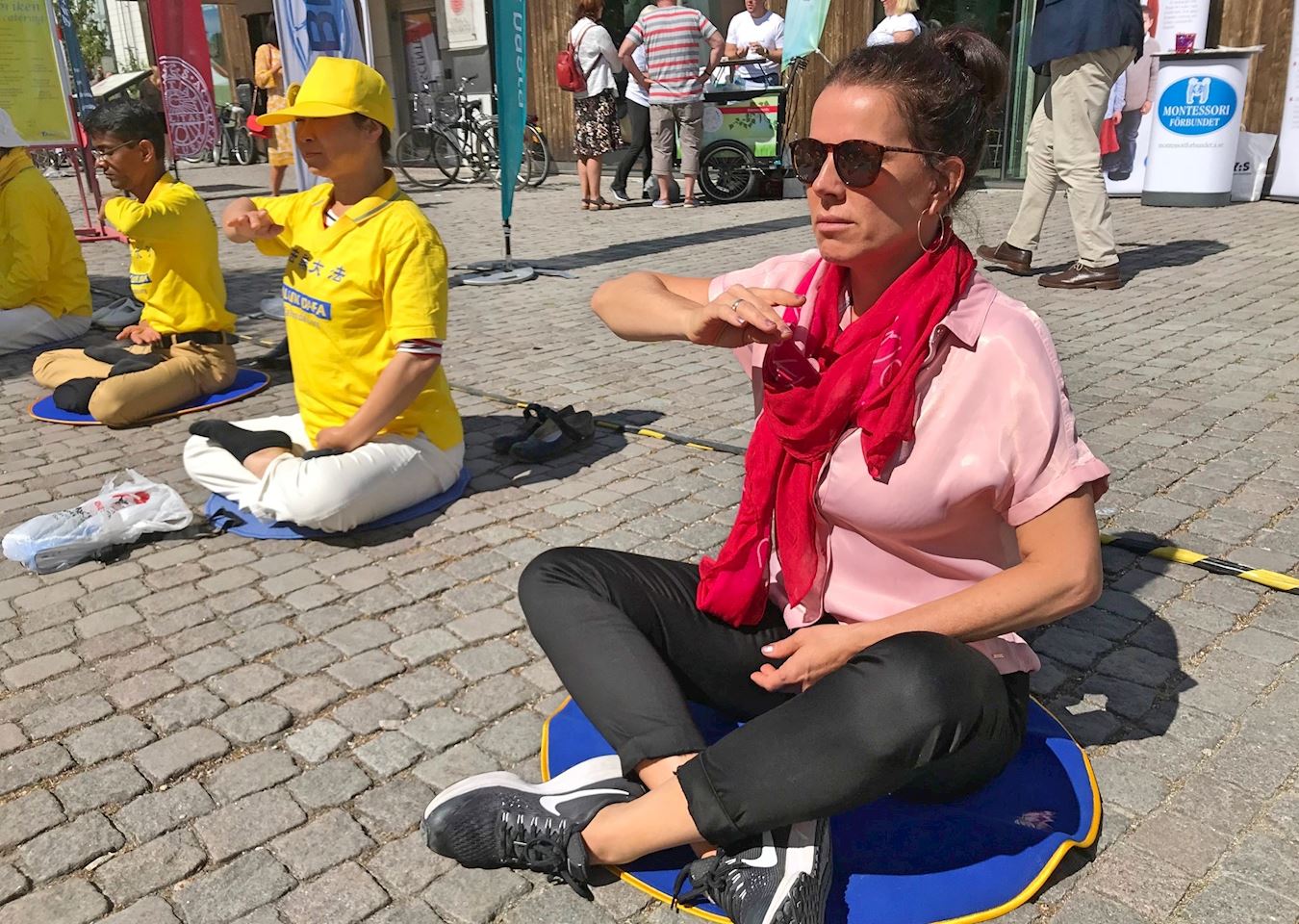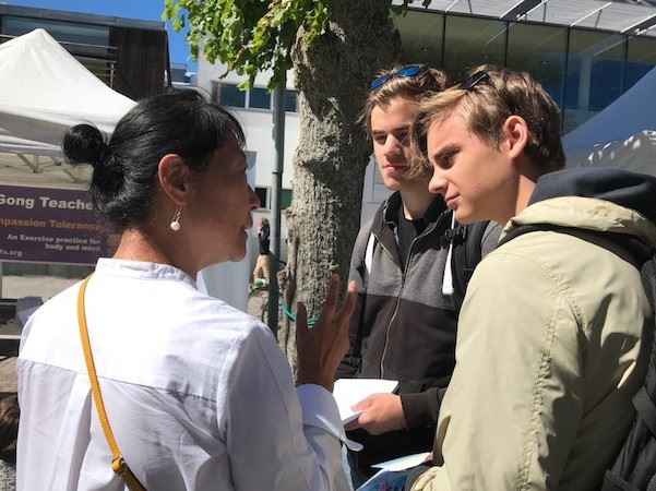 Nine Ordin女士,今年四十八岁,职业是信息咨询。她对人体和精神信仰非常感兴趣,一直在寻找一种方法,如何把身体、精神与世界以及大自然结合起来。经过法轮功的展位时,她默默地观察了很久,说:“我从这里经过,看到你们坐在这里非常安静。虽然你们什么都不说,只是静坐在这里,我却感觉到你们的能量场非常大。我以前也练过打坐,但不是法轮功。我想让我的思想和情绪静下来,所以我愿意坐在这里与你们一起多呆一会。”她和学员聊到她的工作和生活。她告诉学员,她的弟弟在中国居住了很多年,所以法轮功受到中共迫害的情况她都知道一些。与法轮功学员交谈后,她明确表示:“所以,我现在要炼法轮功了!”