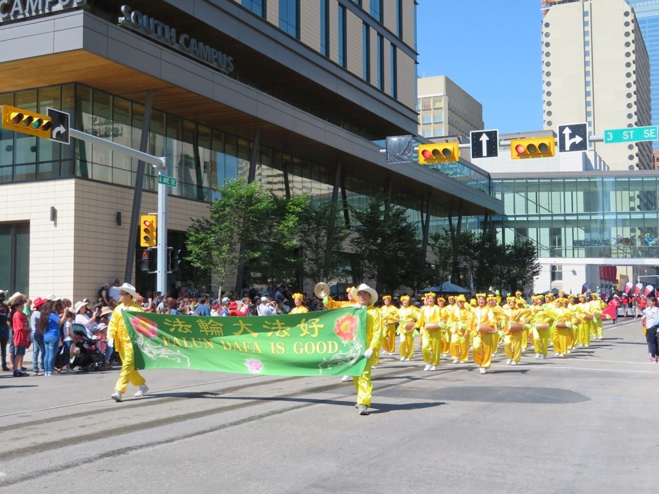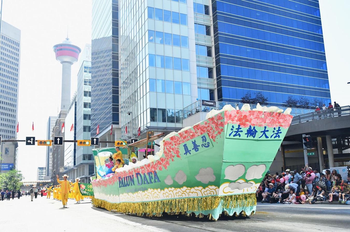来自当地和自温哥华、多伦多、渥太华和旧金山的法轮功学员也参加了牛仔节开幕式游行。法轮功学员的天国乐团、大法船造型的花车、腰鼓队精彩的表演,赢得了观众阵阵热情的掌声,许多人竖起大拇指,很多人合十致意。