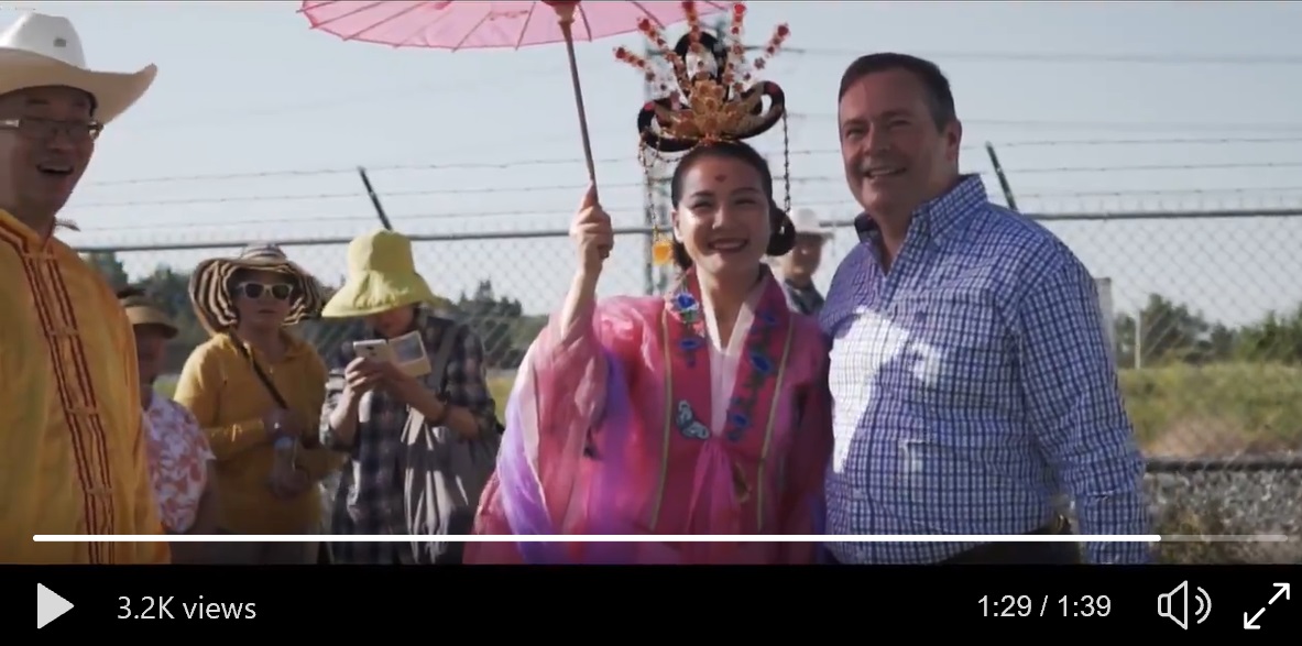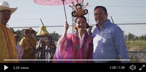 加拿大联合保守党领袖、前国会议员、杰森·康尼(Jason Kenney)先生神采奕奕,在开幕游行前,与随行的工作人员来到游行起点,和腰鼓队和子在大法船上游行的法轮功学员招呼、合影,并与法轮功学员一起高呼:“法轮大法好!”