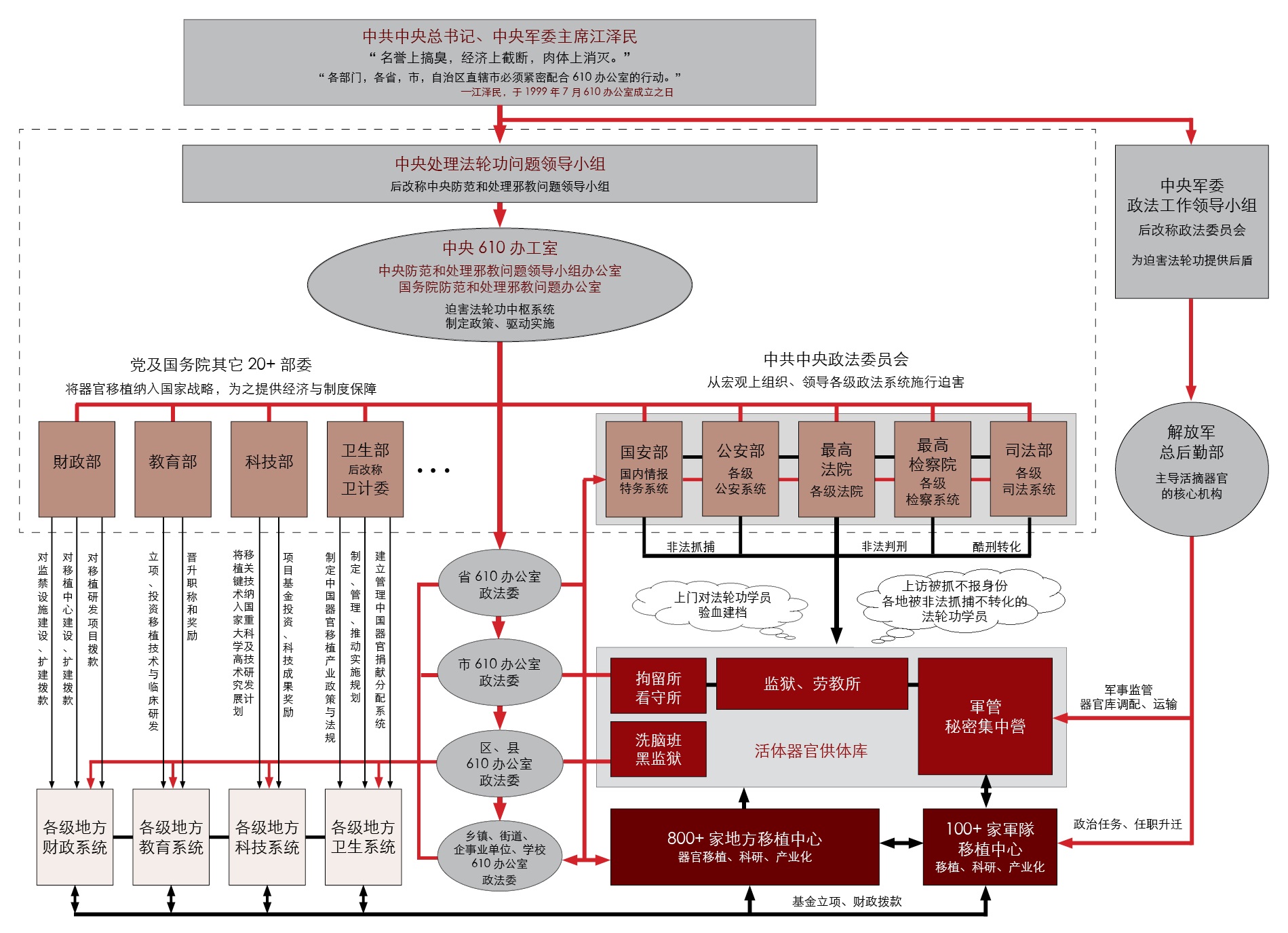 在正式启动迫害法轮功之前,1999年6月10日,中共中央建立了“610办公室”,一个为系统铲除法轮功而法外特设的直属机构,从国务院部委到村镇街道、学校企事业单位,自上而下操控、驱动党、政、军系统实施江泽民的灭绝指令。610办公室和政法委有权调用国安、公安、司法、外交、宣传、财政、文化、教育、科技、卫生等各系统人力及其它资源。中共动用了整部国家机器镇压法轮功。