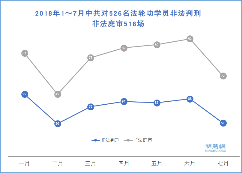 ![]() 图1:2018年1~7月中共对526名法轮功学员非法判刑,非法庭审518场 |