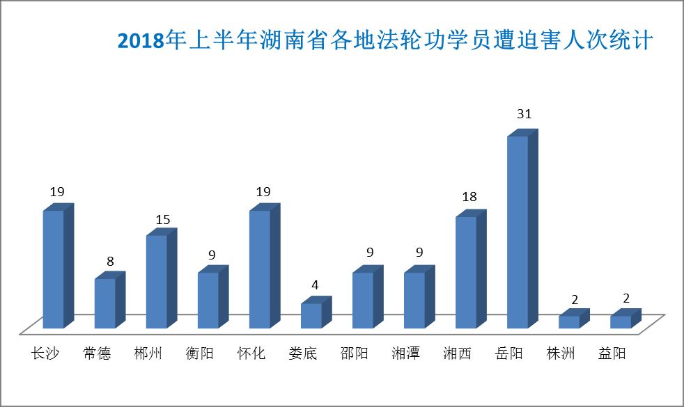 ![]() 图1:2018年上半年湖南省各地法轮功学员遭迫害人次统计 |
