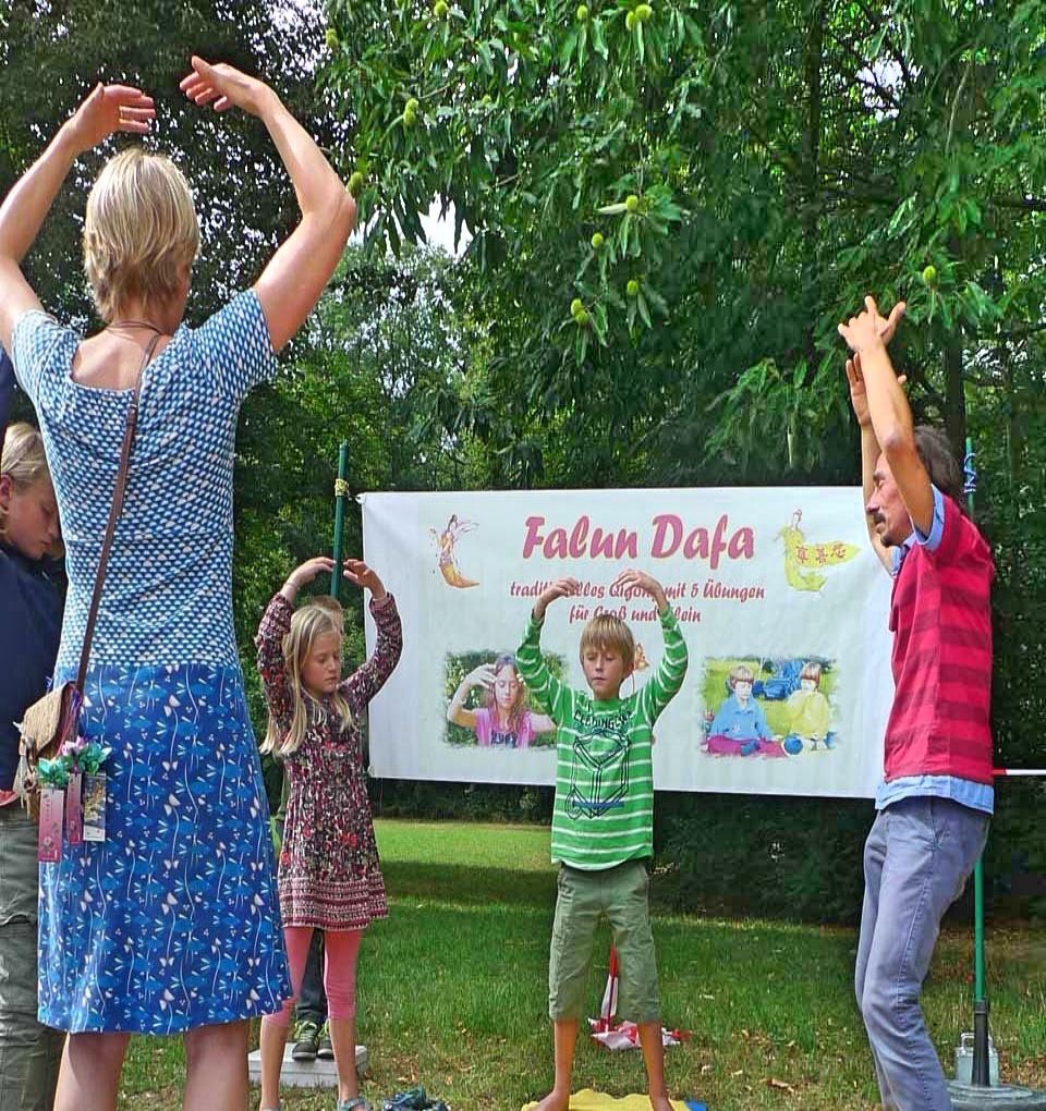 法轮功学员在节日上演示了五套功法,并教孩子们叠莲花。学员们的活动吸引了许多游客,很多家长和孩子现场学功。