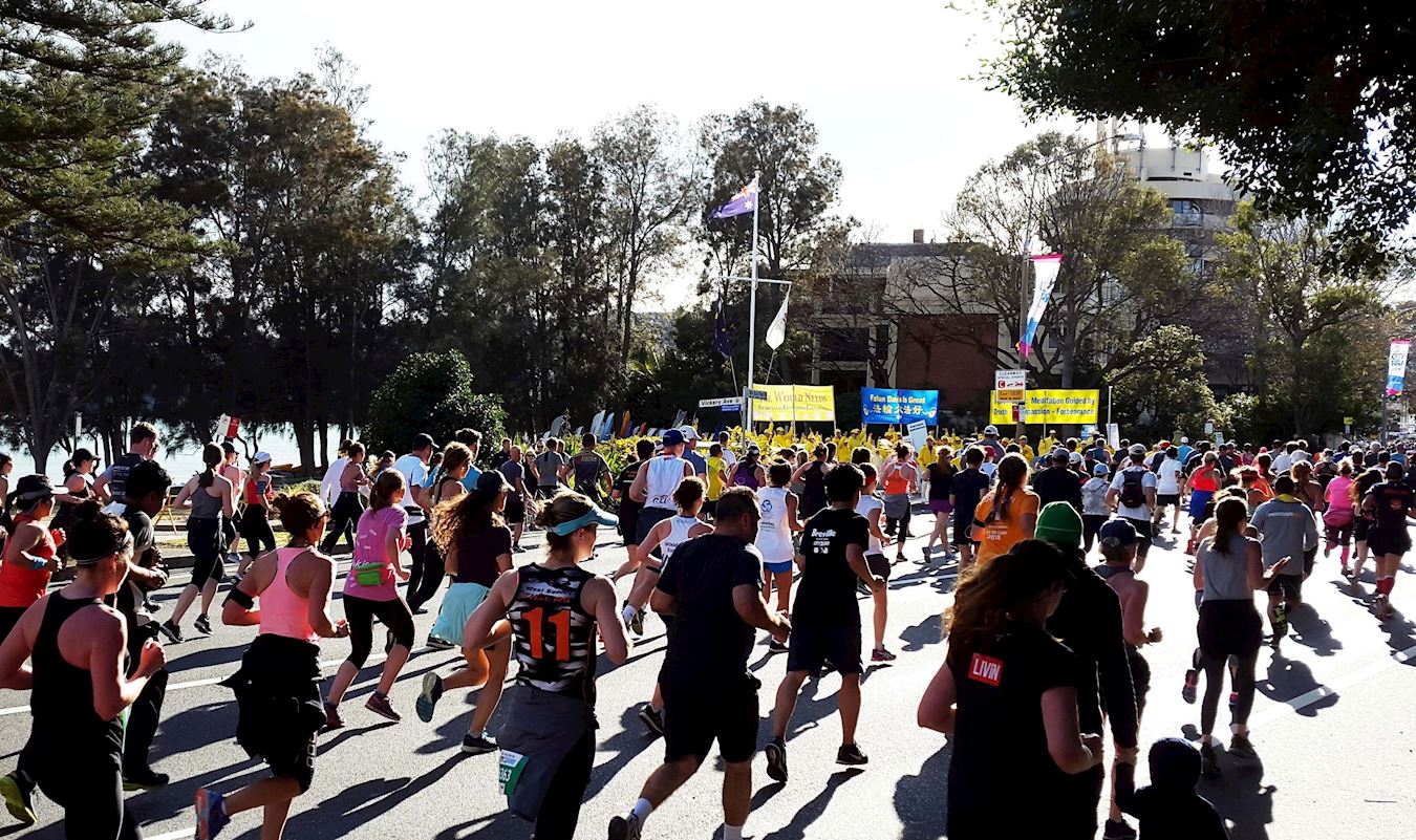 ![]() 图1~2:“从城市到海滩”(City to Surf)慈善马拉松长跑途中,如潮水般的长跑者汹涌而至与祥和的法轮功学员的晨炼在动静中相映成辉 |