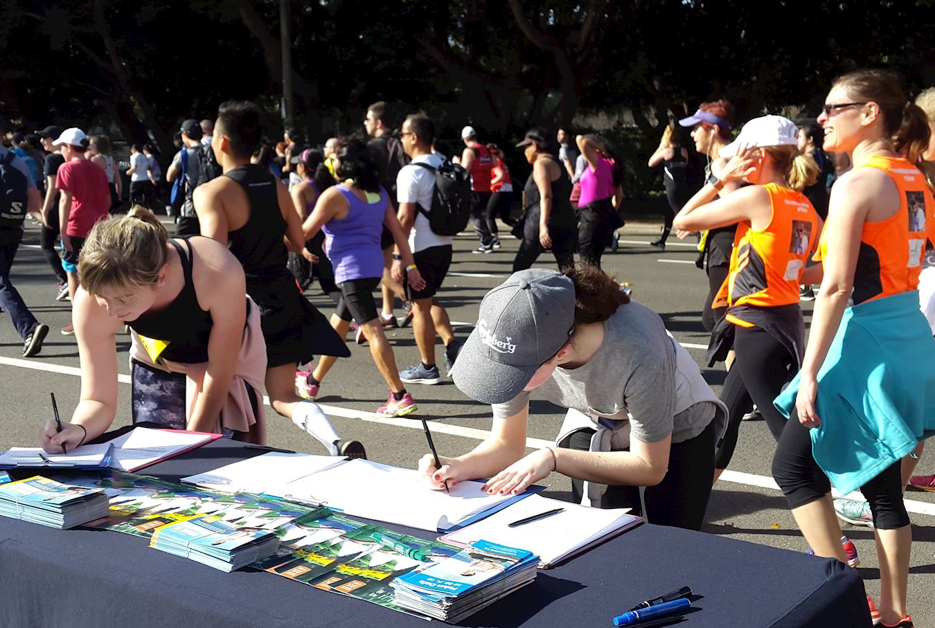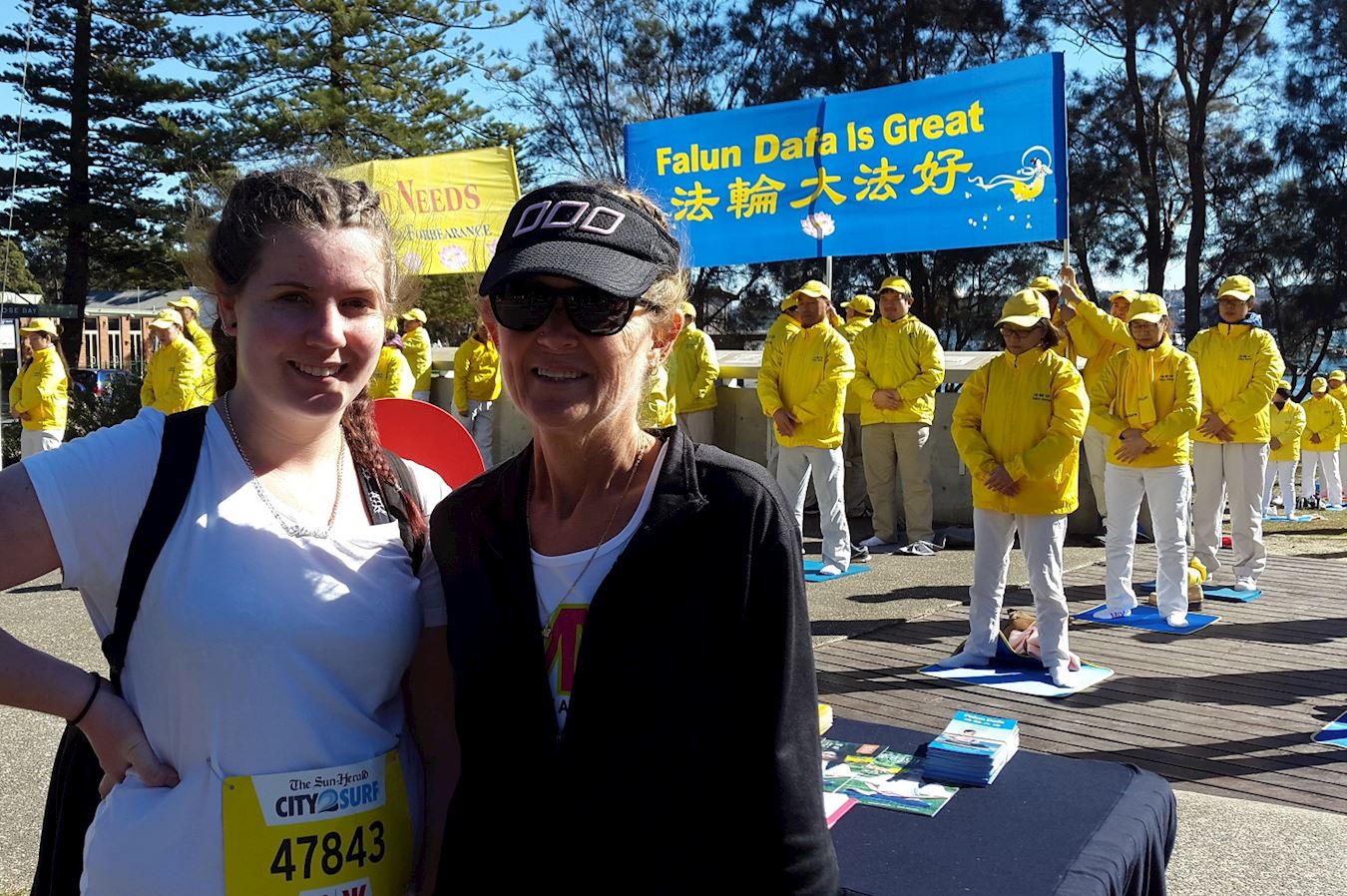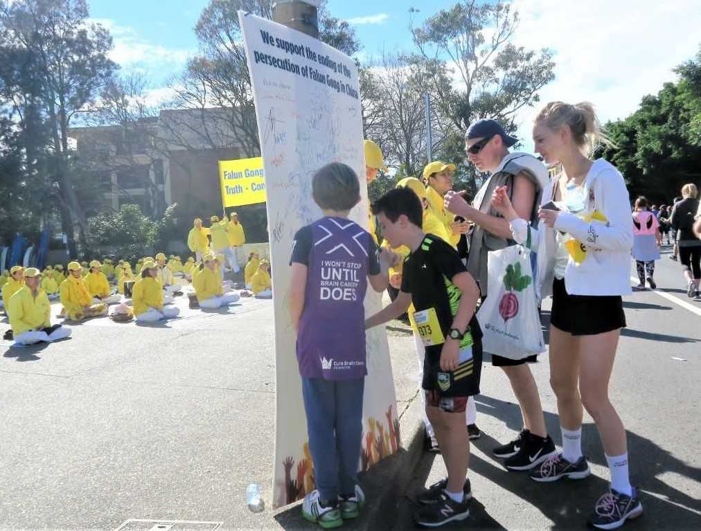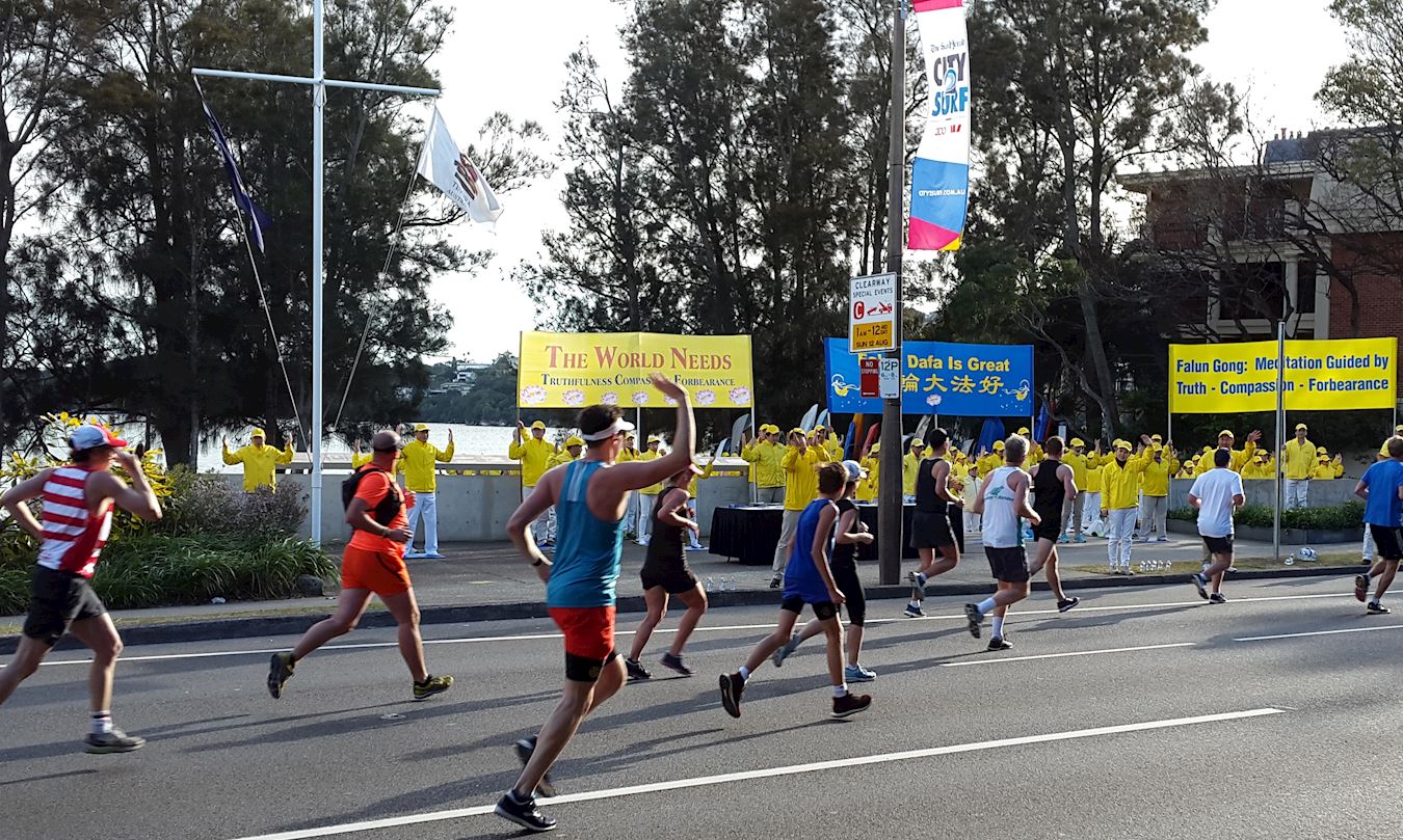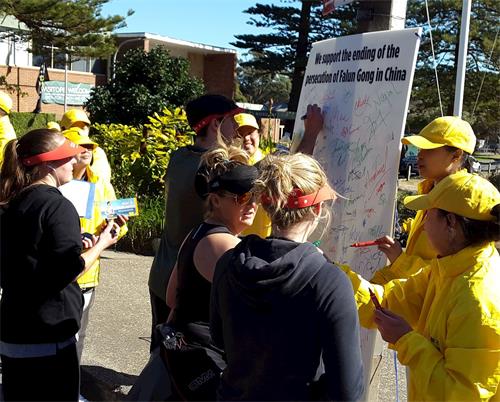 一年一度的“从城市到海滩”活动已经拥有四十八年的悠久而富有启发性的历史。今年有超过八万来自世界各地的兴趣跑步者从悉尼的中央商务区跑到邦迪海滩,抱着实现自我人性的美好和积极为超过900家慈善机构募捐的善良愿望参与此活动,这使整个活动焕发着美好与积极向上的能量场。这些各界志愿者们,当相遇正在路旁炼功的法轮功团体发出纯正的能量场时,自然就会互相激励,好多人大声表达他们的支持:“法轮大法好!”“你们是最棒的!”“祝你们好运!”“你们将赢得胜利!”“感谢法轮功!”还有很多人走到法轮功展位里,有的拿起笔就直接签名支持法轮功反迫害;有的径直走入并站在法轮功团体中学着炼功;还有的人问询在哪里可以学炼法轮功。