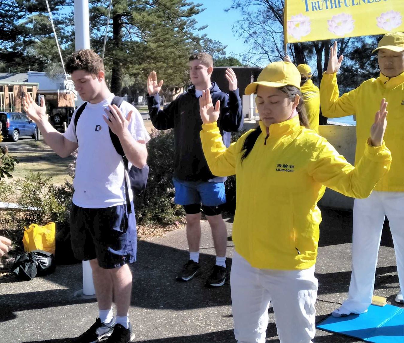 年轻人爱德华(Edward)和迪杰(DJ)被法轮功强大的正的能量吸引着,直接走入炼功队伍,他们表示炼了几分钟就感觉很舒服,平时因为自己很忙,无暇静下来,这次正好遇见法轮功,炼完功后,他们表示还想回去继续了解更多法轮功真相。