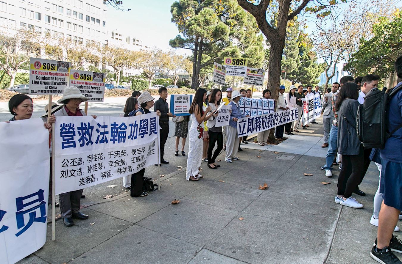 二零一七年十月二十六日,美国旧金山湾区法轮功学员来到旧金山中领馆前举行抗议集会,要求中共立即释放近日在青岛被绑架的山东省公丕启等二十多位法轮功学员。
