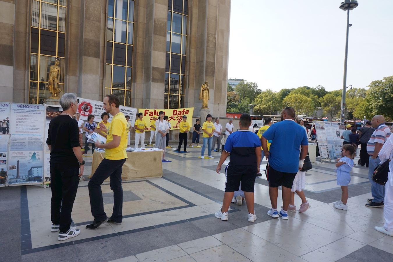 ![]() 图6:8月19日,巴黎部份法轮功学员在人权广场上和过往世界各国的游客交谈 |
