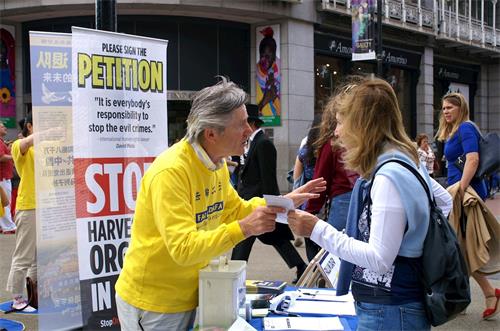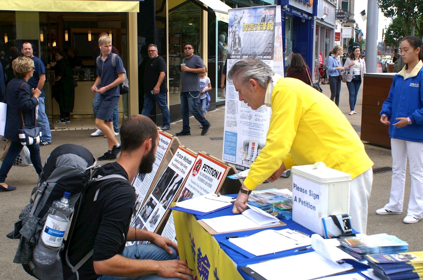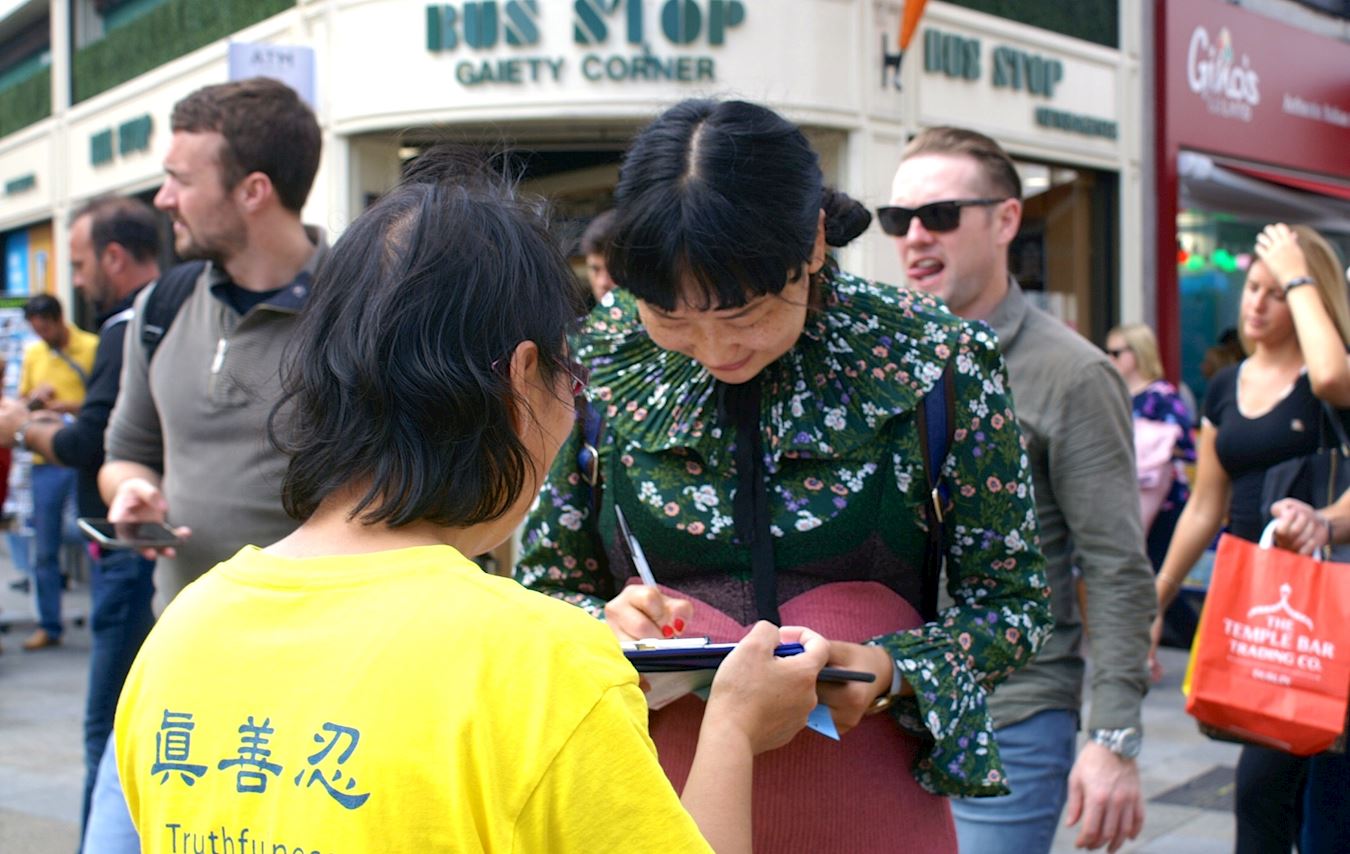 还有一位年轻女士来签名,说她非常了解法轮功。她自我介绍说自己和父母住在中国大使馆附近。她经常看见学员在使馆外面的和平抗议活动。她说住在使馆附近的人都很支持我们,学员感谢她的善意支持,并告诉她我们为什么去那里,她完全支持。