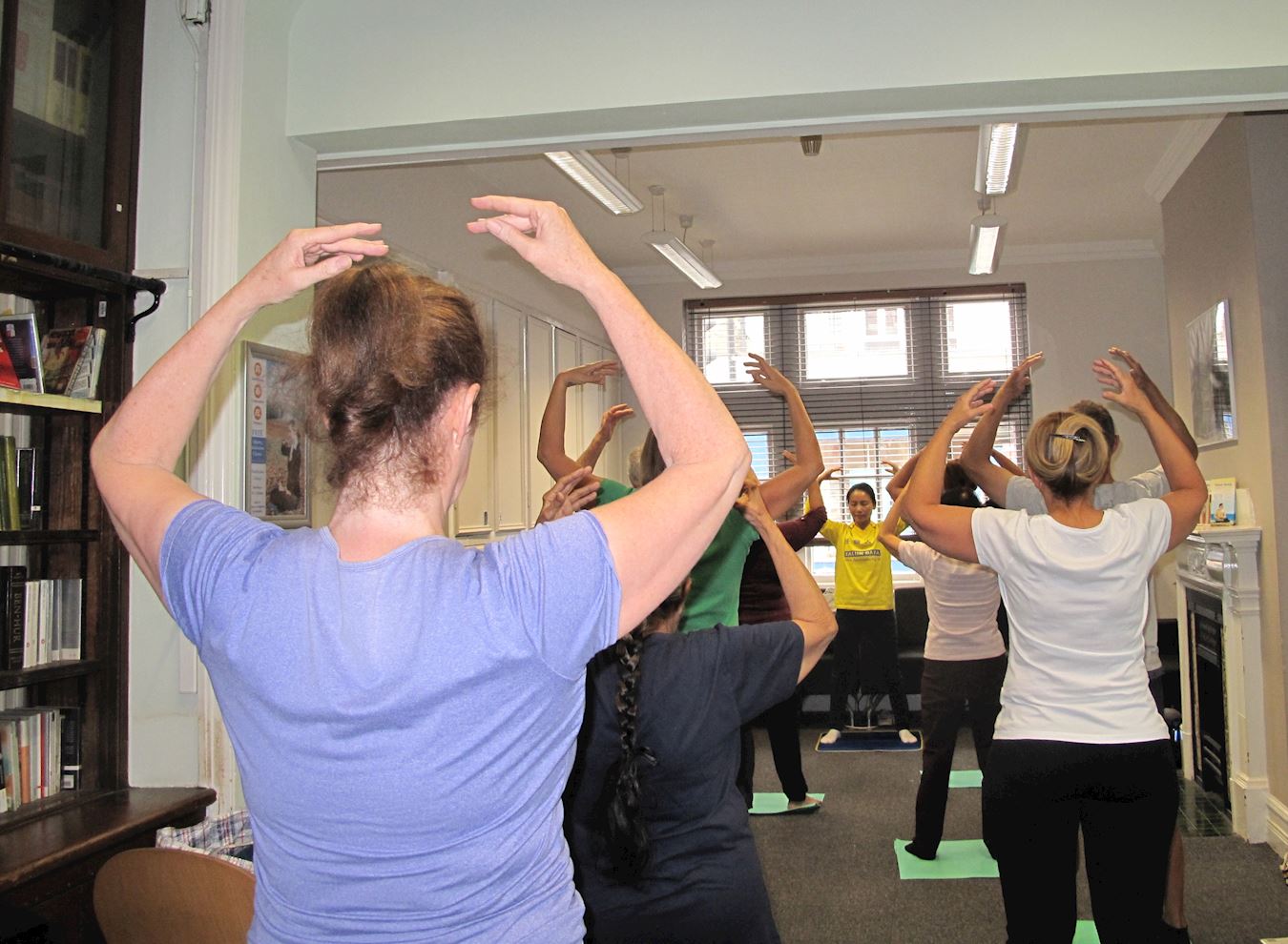 图1:二零一八年八月十八日,温布尔登图书馆的法轮功义务教功班上,法轮功学员温迪(Wendy)和大家一起炼功