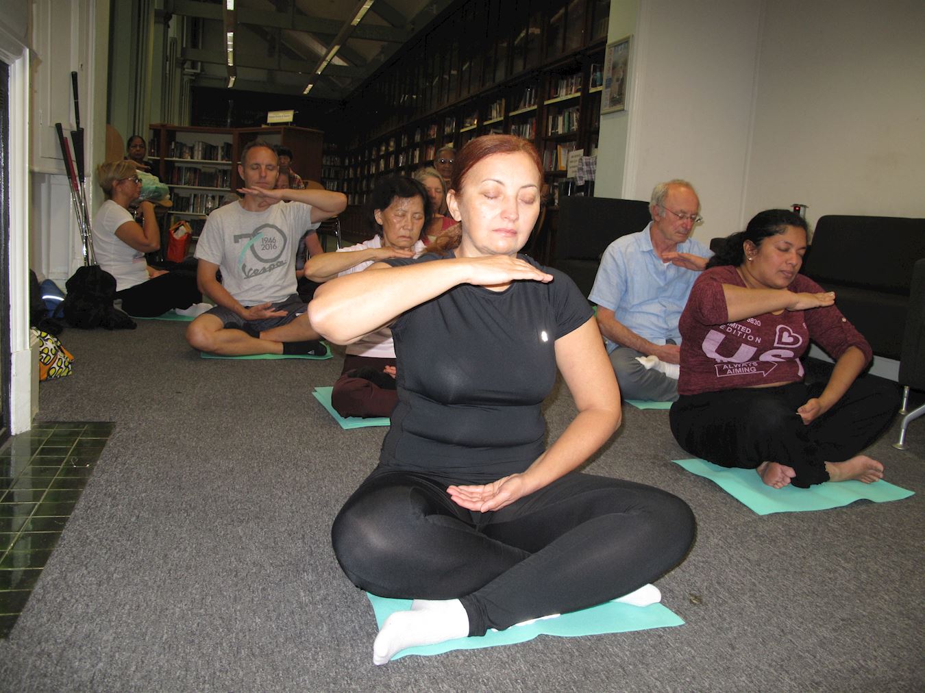 图2:二零一八年八月十八日,温布尔登图书馆的法轮功义务教功班上正在打坐的学员。右边第一位印度裔女士是第一次来,左边一位来自前东欧国家的女士是第三次来。