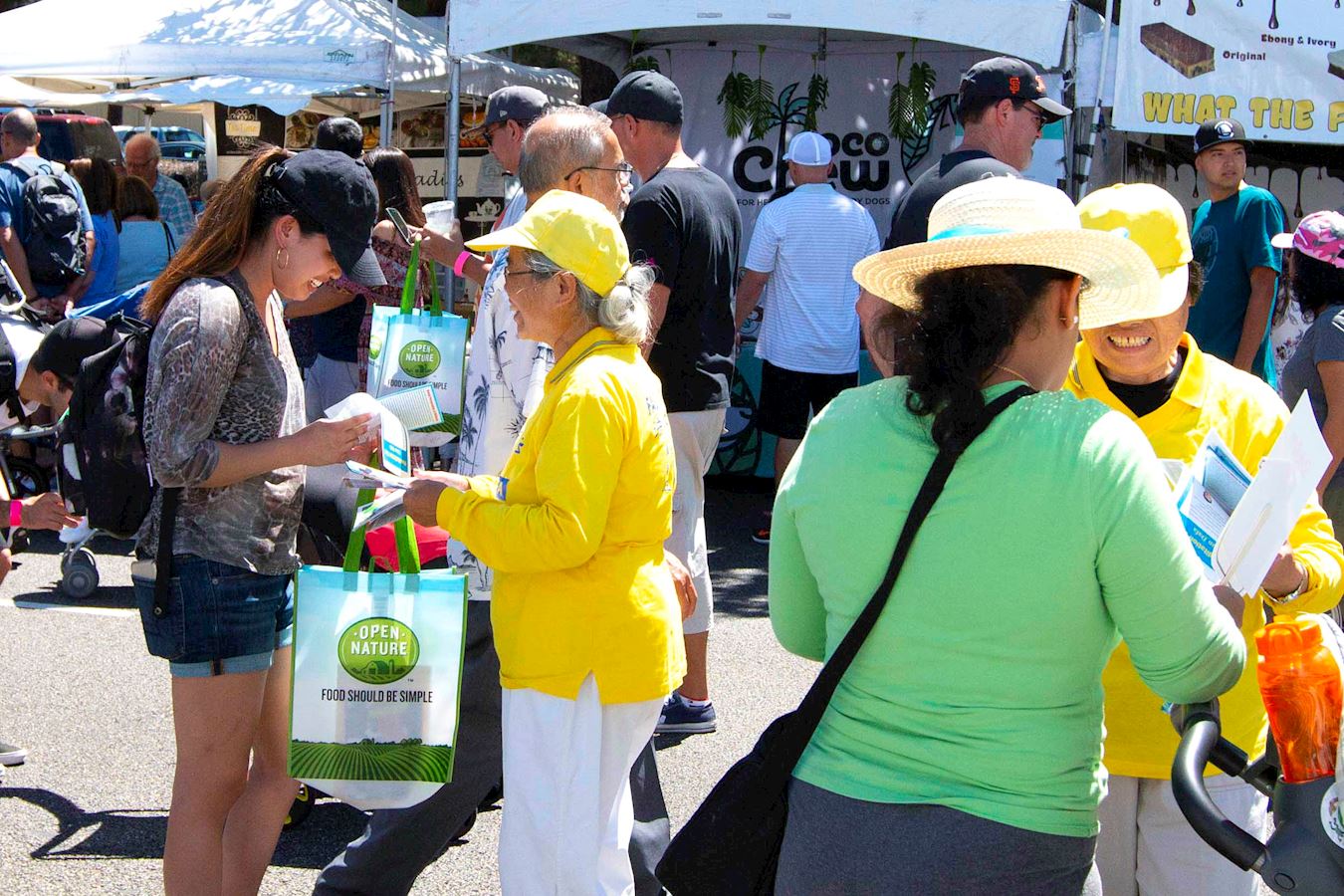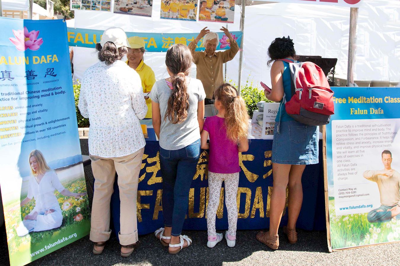 两天的佛利蒙艺术节每次都吸引几十万人。不少游客听到法轮功祥和的炼功音乐而驻足,有的还模仿法轮功学员的炼功动作,希望能进一步了解法轮功,