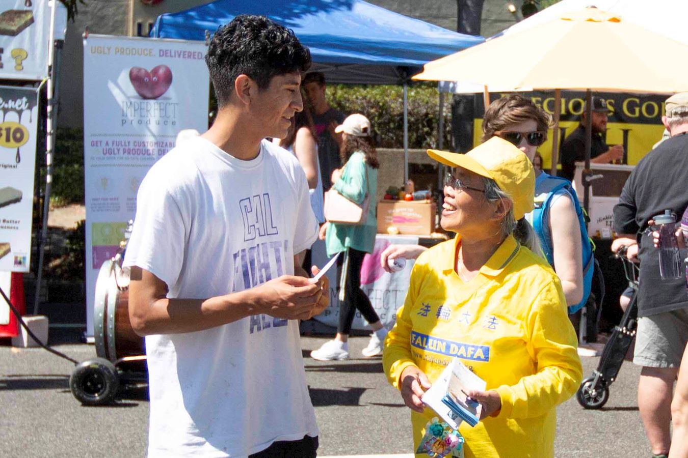 迈克尔(Michael)因为工作关系去过中国,星期天, 他带着朋友来艺术节, 经过法轮功的摊位时,他兴奋的说他知道法轮功:“我知道共产党在中国迫害法轮功。其实他们是一群打坐炼功,让身体更健康,做一个好人。中共不应该迫害他们。”