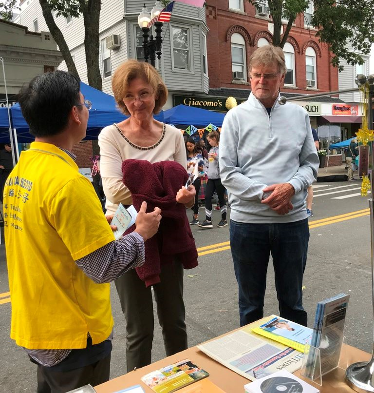 ![]() 图:美国麻萨诸塞州梅尔若斯镇(Melrose)的维多利亚节庆活动上,游客听法轮功学员介绍功法 |