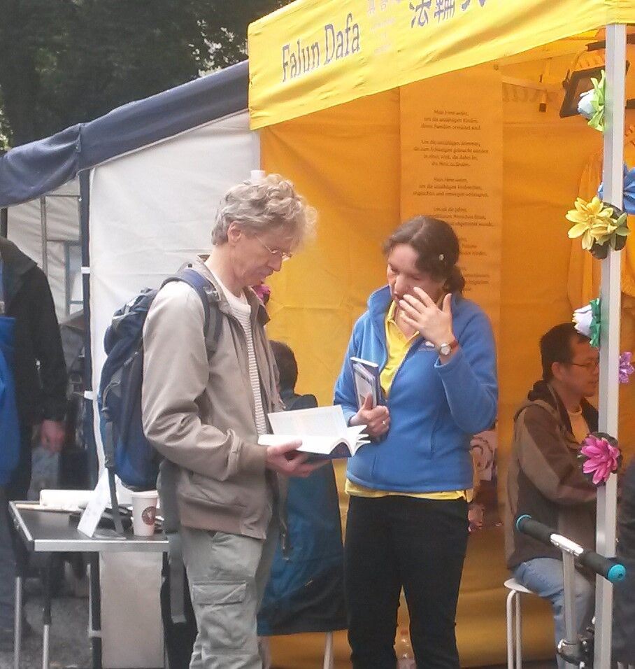 两天活动中,“哪里可以学功?”是游客们最常提出的问题。一同来到展位的两位中年女士被功法的轻柔动作所吸引,仔细观看了一段时间。得知法轮功修炼者所遵循的真、善、忍原则和五套简单易学的功法之后,其中一位询问汉堡是否有学习班。了解到人们可以每周日在汉堡“花卉植物园”现场学功时,她对于免费教功感到非常惊讶。两位女士在离开时带走了介绍资料,并热情地对学员表示感谢。