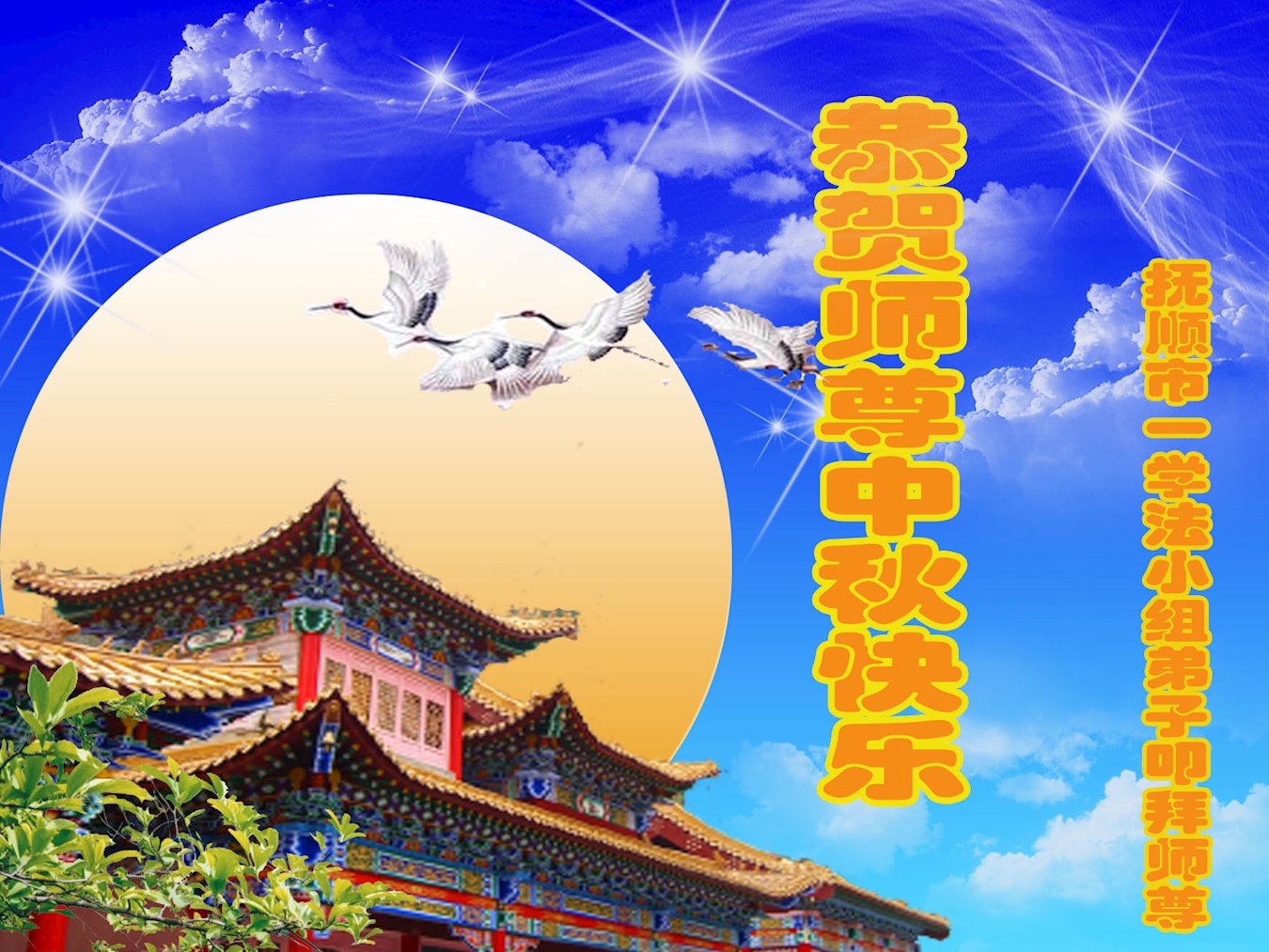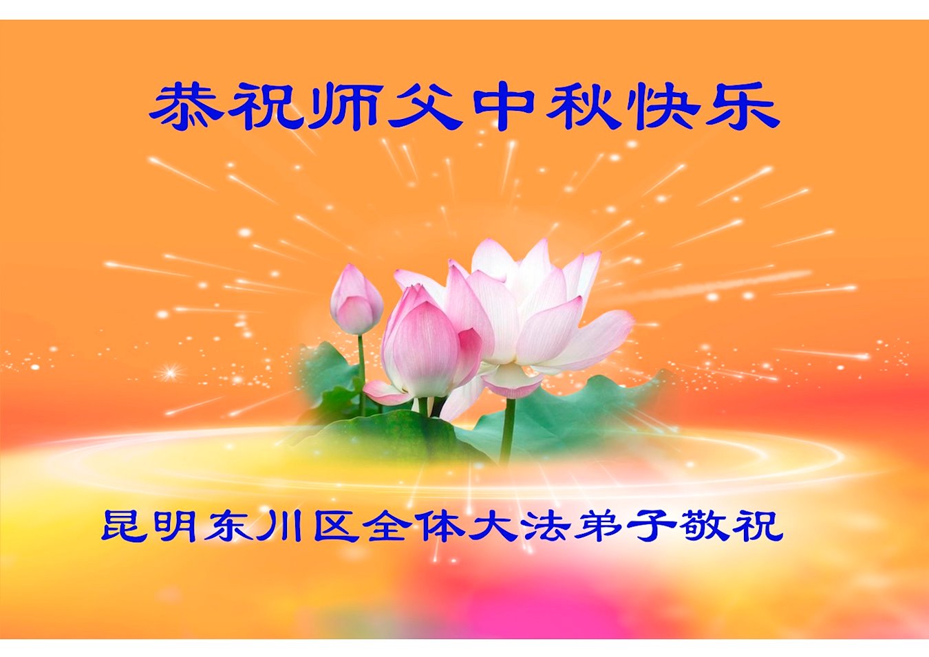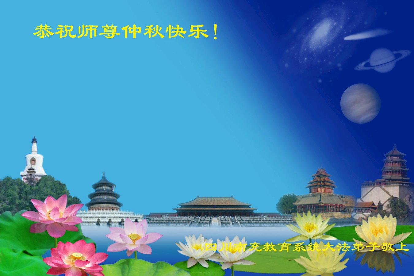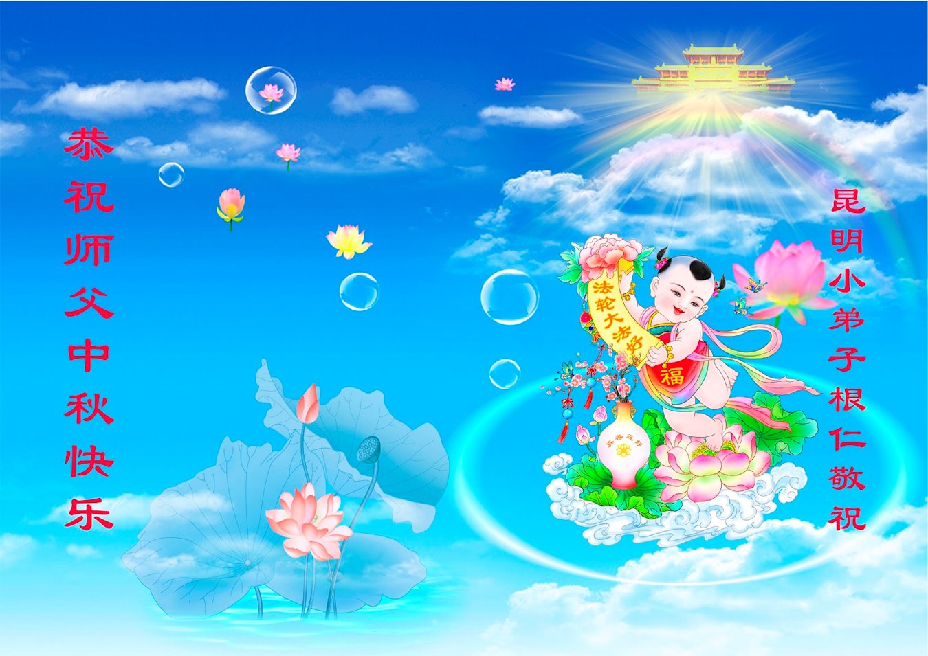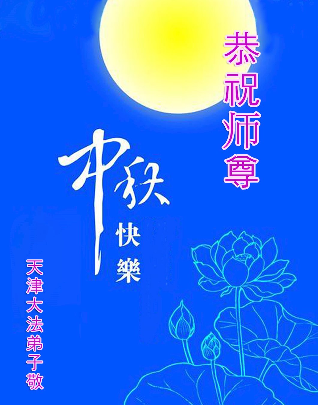 师尊您好!师尊辛苦了!在这中秋佳节来临之际,弟子非常想念师尊,弟子心怀无限的感恩和崇敬恭祝师尊中秋快乐!在弟子修炼路上每前進一步,都浸透了师尊的无量慈悲和巨大付出,弟子叩谢师尊佛恩浩荡! 我们要学好法、学懂法,修好自己,在提高心性上多下功夫,认真做好三件事,这是我们的责任,我们一定会做得更好,因为我们有伟大的师父,有伟大的法!