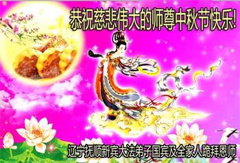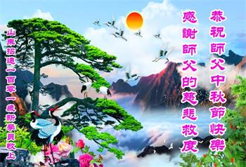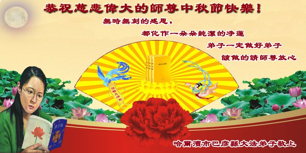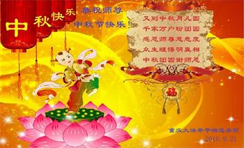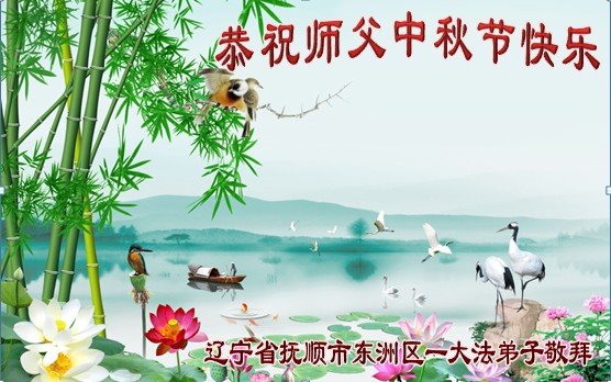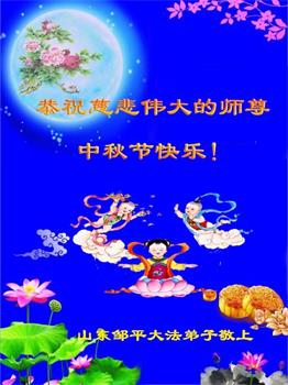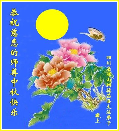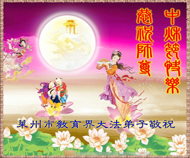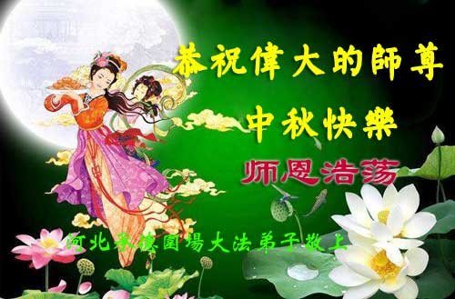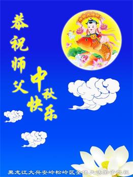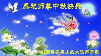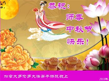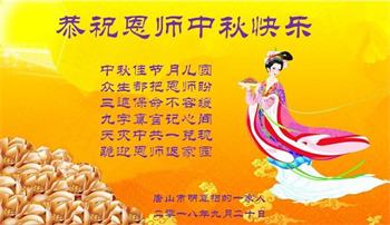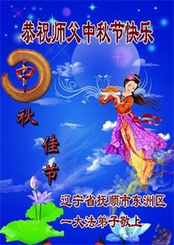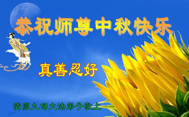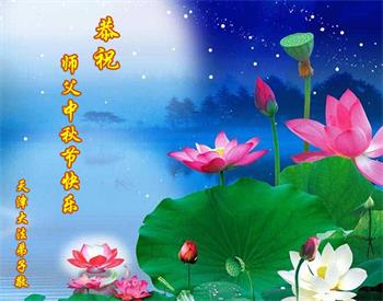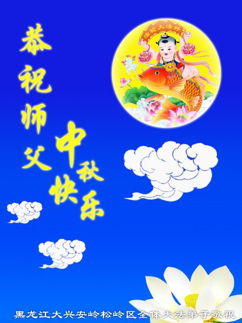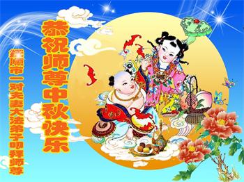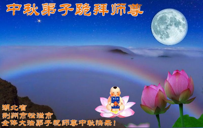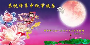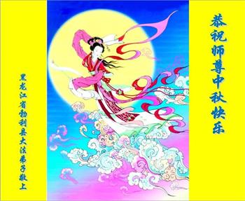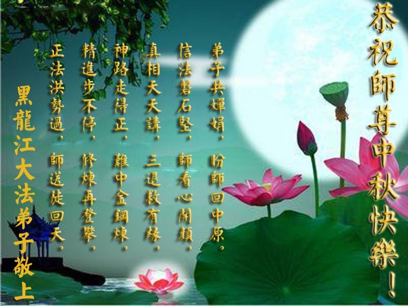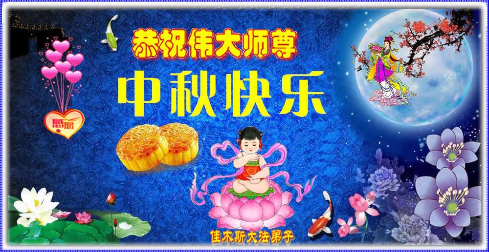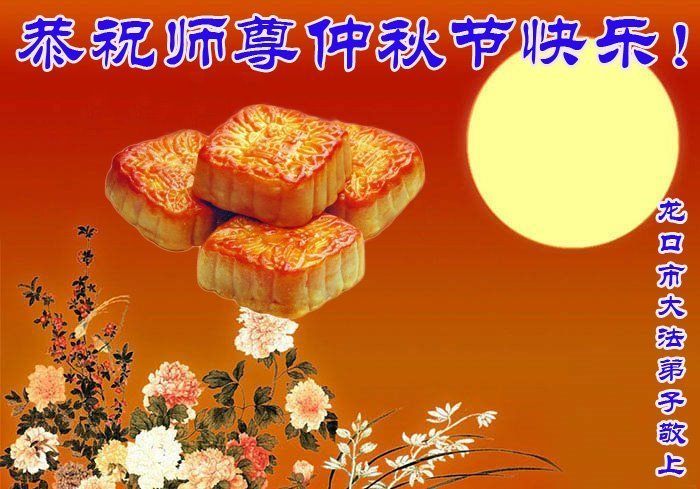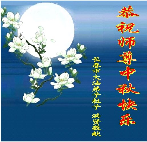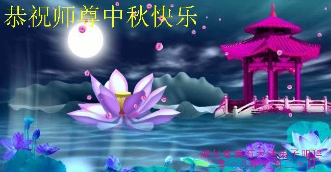 中秋佳节到来了,弟子恭贺师父佳节快乐!中秋是圆满的日子,弟子深深知道师父给予我们的法轮大法,能使我们修炼圆满。一些同修在大法中修炼勇猛精進,修成了,成为真正的大法徒,他们无愧师父的慈悲救度, 无愧于他们世界众生的期盼,他们的生命已经走向永恒。弟子惭愧,在目前师父的巨大承受下延长的修炼时间里,还不知道很珍惜,至今还有很多执着没有放下,没有修去,弟子希望能在今后的修炼中严格按法轮大法的要求去修炼,走向圆满。弟子无限感激师父的洪大慈悲救度之恩,在中秋佳节叩谢师父!,弟子给师父深深的敬合十礼!