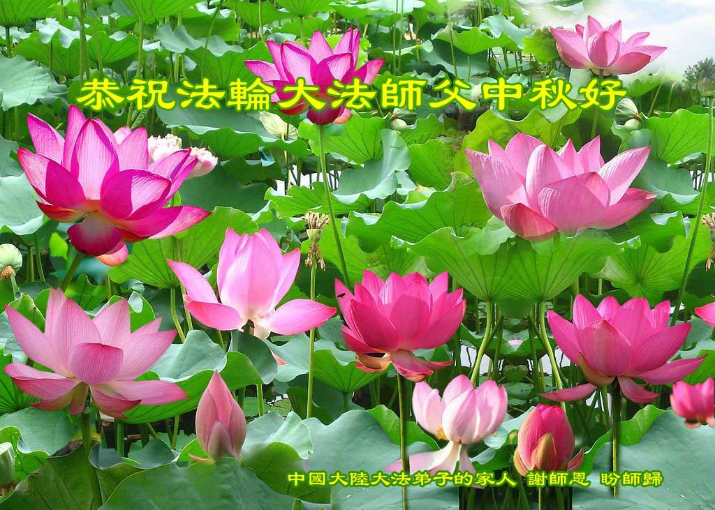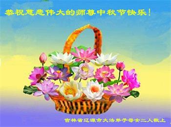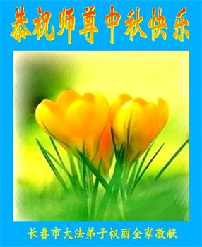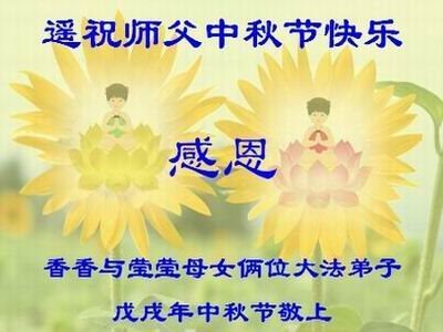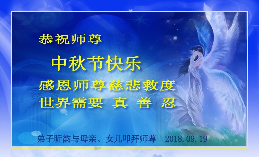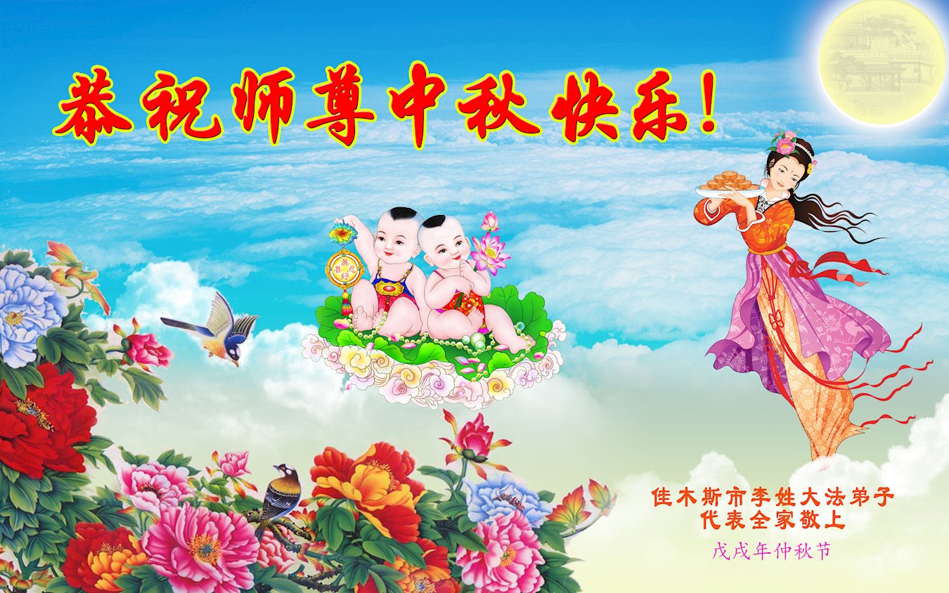 师父洪大的慈悲、为众生艰辛的付出,倾尽人类所有的语言都无法表达。值此中秋佳节之际,我和我的女儿——昔日的小同修恭祝慈悲伟大的师尊中秋快乐!并叩谢师恩!我女儿于一九九七年不到十岁时就随我到炼功点炼功,参加过四、二五。一九九九年七.二零法轮功被迫害的前一天,我们参加了最后一次集体炼功。那天,我对女儿说,咱们一起回到天上去好吗?女儿说好。就这一字的应诺,师父就一直在管着她。法轮功被迫害后,我怕未成年的孩子应付不了残酷的迫害,就没带她继续修炼。但师父始终没有放弃她。前几年,师父安排她来到海外修炼,然而由于某些原因,她没能走入修炼。最近师父再次为她做了安排,她终于走進了修炼。慈悲伟大的师父不想落下每一个昔日同修和当年的小弟子,希望还没有走回修炼的同修,不枉师父的慈悲苦度,赶快回到大法中来吧。再次叩谢师恩!合十