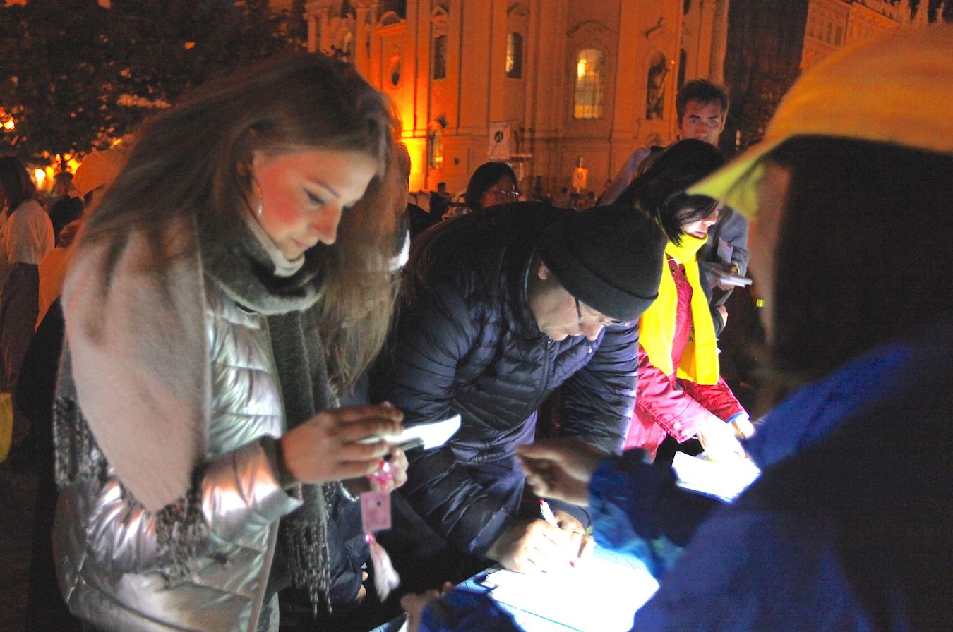 二零一八年九月二十八日晚,来自欧洲三十七国的部份法轮功学员参加了组字活动。时逢捷克人民纪念其守护者瓦茨拉夫的节日,也是捷克国家意识纪念日,老城内人山人海,摩肩接踵,游客如织,加上节假日,布拉格老城广场上的人群更是川流不息。