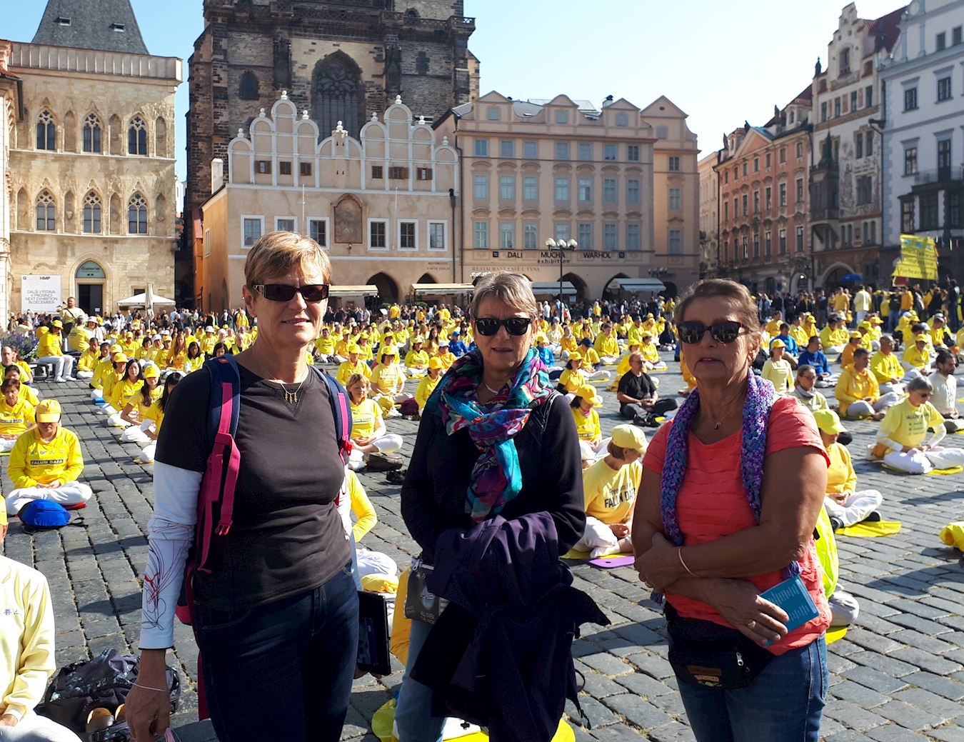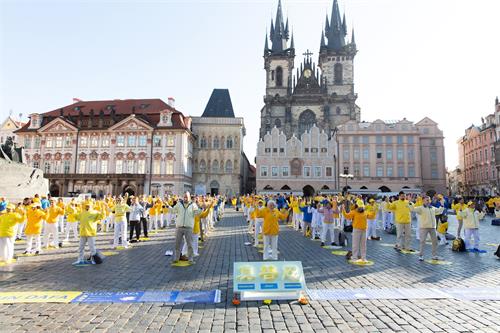 ![]() 图1~3:二零一八年九月二十八日上午,来自欧洲各国的一千五百多名法轮功学员聚集在布拉格的老城区广场,进行了集体炼功、讲真相和征集签名反迫害活动 |