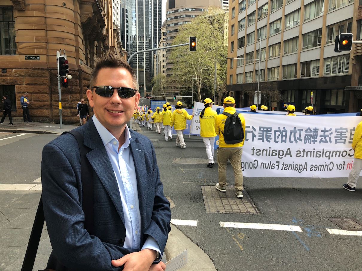 医生马克·盖塔斯 (Michael Gathas)在路边驻足非常仔细地欣赏游行队伍。身为一名医生,他相信活摘器官这种事会在中国发生。他表示,人体器官移植需要签署同意书,在没有征得捐赠人同意的情况下是绝对不可以做这种事的。“人,拥有主宰自己身体的权利,对于他人的侵犯有权利说:‘不,这是我的身体,我不接受。’然而中国人没有人权,这是非常错误的。”他接着说:“虽然澳洲政府很难干涉中国的事,但是可以给中国设个典范,告诉他们这种事在澳洲是不可能被接受的,如果当明确知道在中国获取器官的途径是非法的,澳洲政府就应该设定法律,不让澳洲人去中国做器官移植。”