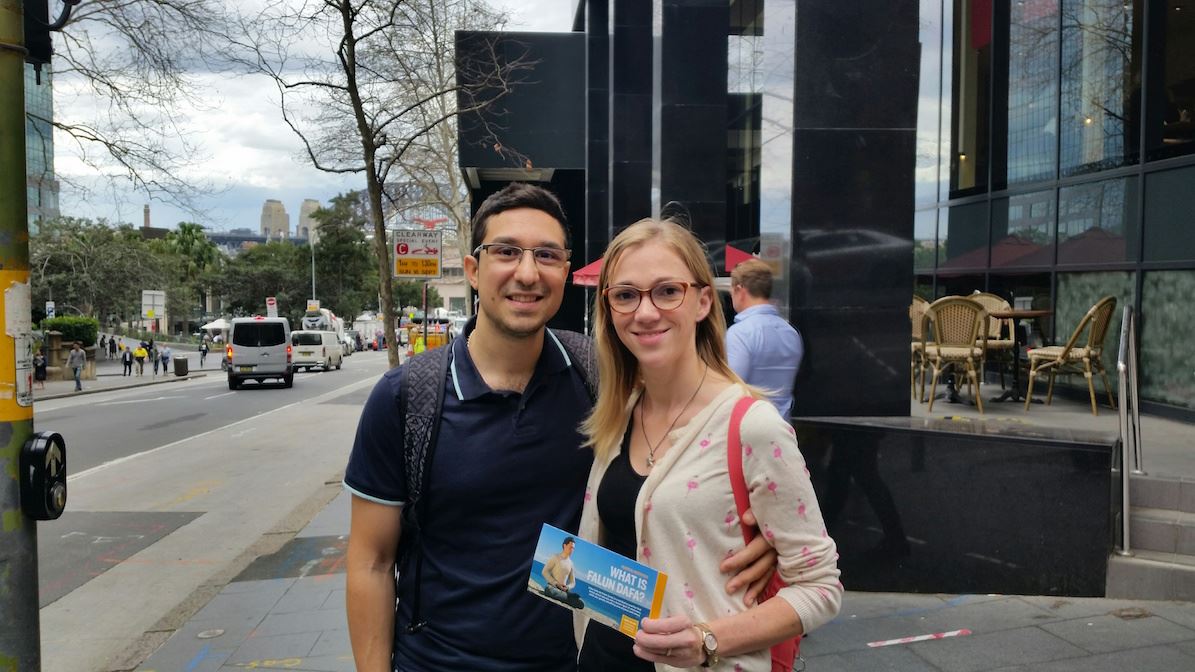 当天,金·特恩布里奇(Kim Tunbridge)女士如往常一样,从悉尼市中心环形码头的火车站出来,脚步匆匆,准备奔向公司上班,忽然对面一片明亮的金黄色身影吸引她停下脚步一探究竟,她面对上书着“法轮功是以真善忍为准则的修炼”的一条数米长横幅看着,然后对着炼功的人群和横幅拍了又拍。