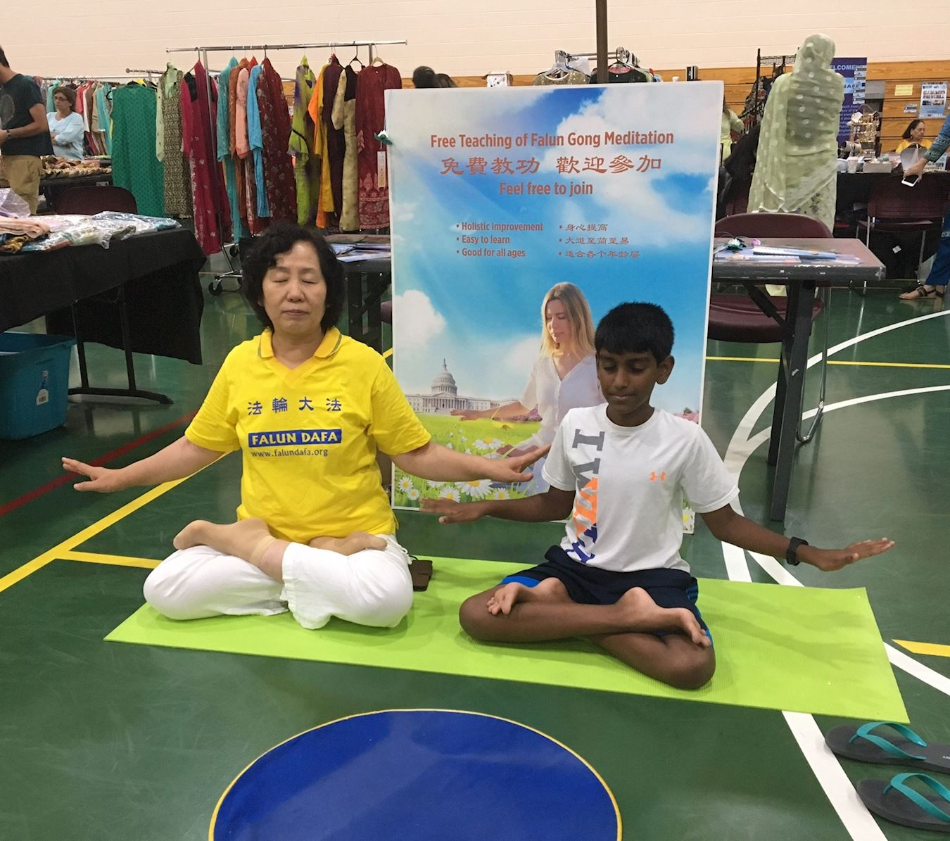【明慧网二零一八年九月八日】二零一八年九月一日,法轮功学员们来到美国马里兰州盖城的社区集市介绍功法,受到人们的欢迎,来学功的人络绎不绝,直到活动结束时间,还有人接着学功。路过展位的民众几乎一半的人来学功或者在周围看学功,路过的人几乎都拿到了法轮功真相传单。