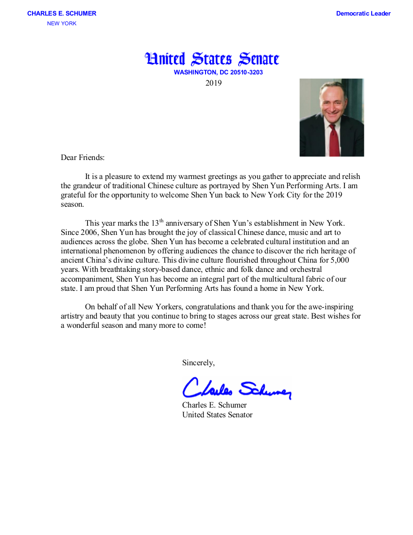 纽约州资深联邦参议员、联邦参议院少数党领袖舒默(Charles E. Schumer)为神韵演出发来贺函,他表示,“当人们在一起感恩并享受由神韵艺术团所带来的伟大的中国传统文化之际,在此表达我最热烈的问候,非常高兴有机会欢迎神韵重返纽约的舞台,带来2019的演出季。”