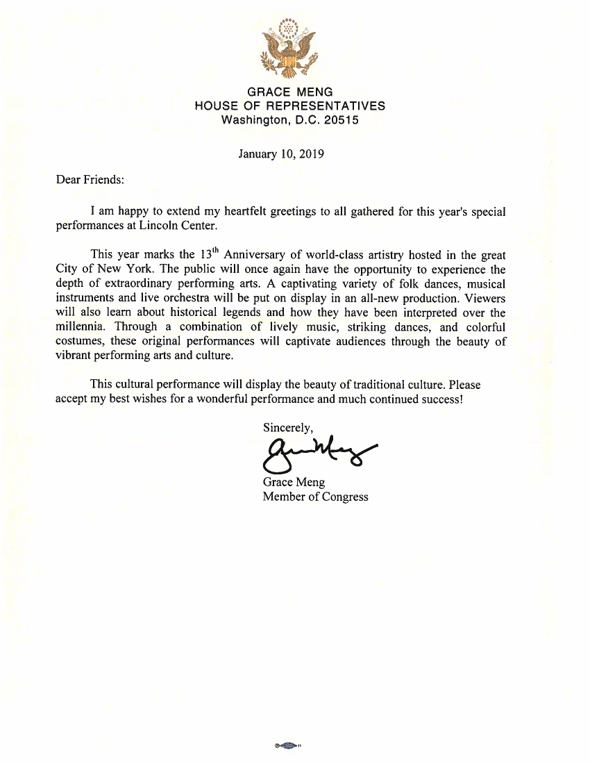 纽约州第六选区华裔国会众议员孟昭文(Grace Meng)发来贺函,对神韵在纽约开演表达祝福:“我对林肯中心这场特别演出的所有的演员与观众,表达衷心的祝福。”