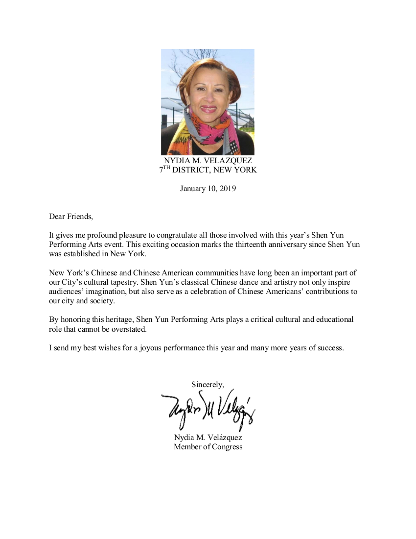 纽约州第七选区国会众议员维乐贵丝(Nydia M. Velazquez)发来贺函,她说:“我非常高兴地向所有参与以及主办神韵艺术团活动的全体人员表达祝贺,迎来神韵在纽约第13年演出这激动人心的时刻。”
