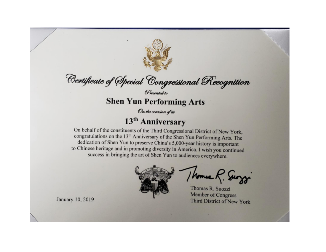 纽约州第三选区国会众议员舒奥齐(Thomas R. Suozzi)致贺函表示,“神韵艺术团的钜献保存了中国五千年的历史,这对于在美国承传中国的传统及推广多元化非常重要。我祝贺神韵演出成功,祝愿神韵广传到每一个观众。”