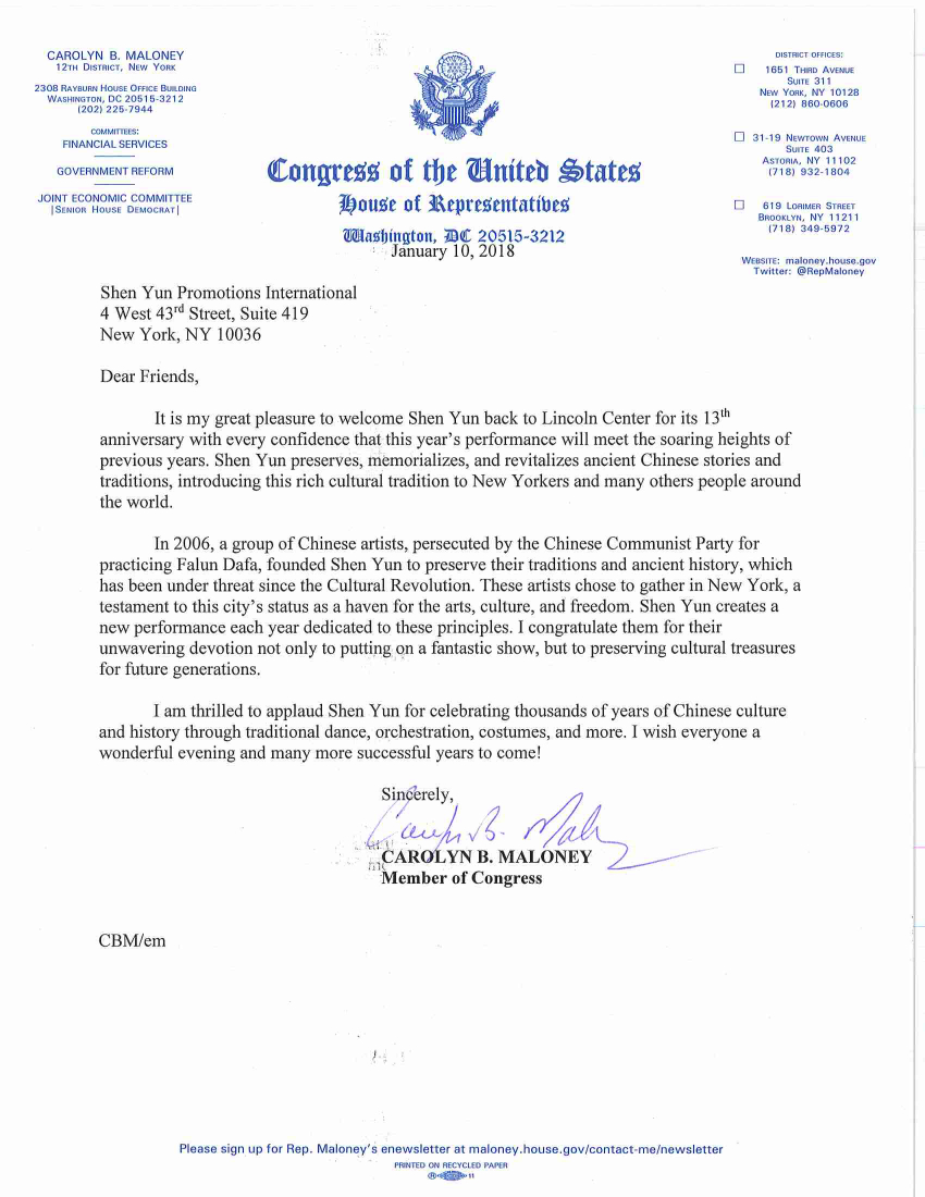 ![]() 图6:国会众议员卡洛琳·马隆妮(Carolyn B. Maloney) 给2019纽约神韵演出的贺函。 |