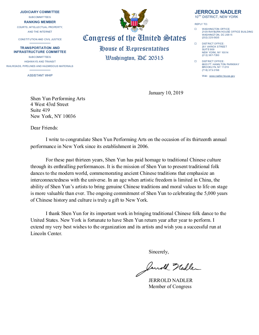 ![]() 图7:国会众议员杰里·纳德勒(Jerrold Nadler)给2019纽约神韵演出的贺函。 |