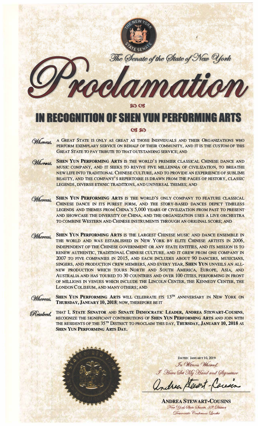纽约州参议院多数党领袖史都华-考辛斯(Andrea Stewart-Cousins)向神韵艺术团颁发褒奖状,并把一月十日——神韵艺术团2019年在纽约的开演日定为“神韵艺术团日”。