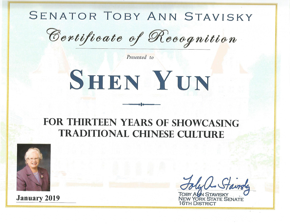 纽约州第十六选区参议员、纽约州参议院高等教育委员会主席史塔文斯基(Toby Ann Stavisky)发来褒奖令,她说:“褒奖神韵第十三年带来传统的中国文化。”