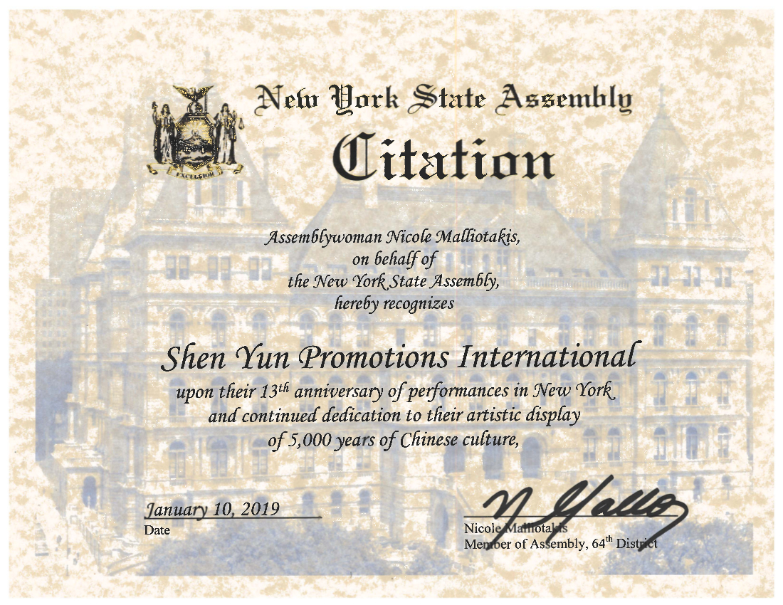 纽约州第64选区众议员玛丽奥塔基斯(Nicole Malliotakis)发来褒奖令,褒奖令写道:“表彰他们致力于以艺术形式展现五千年的中华文化。”