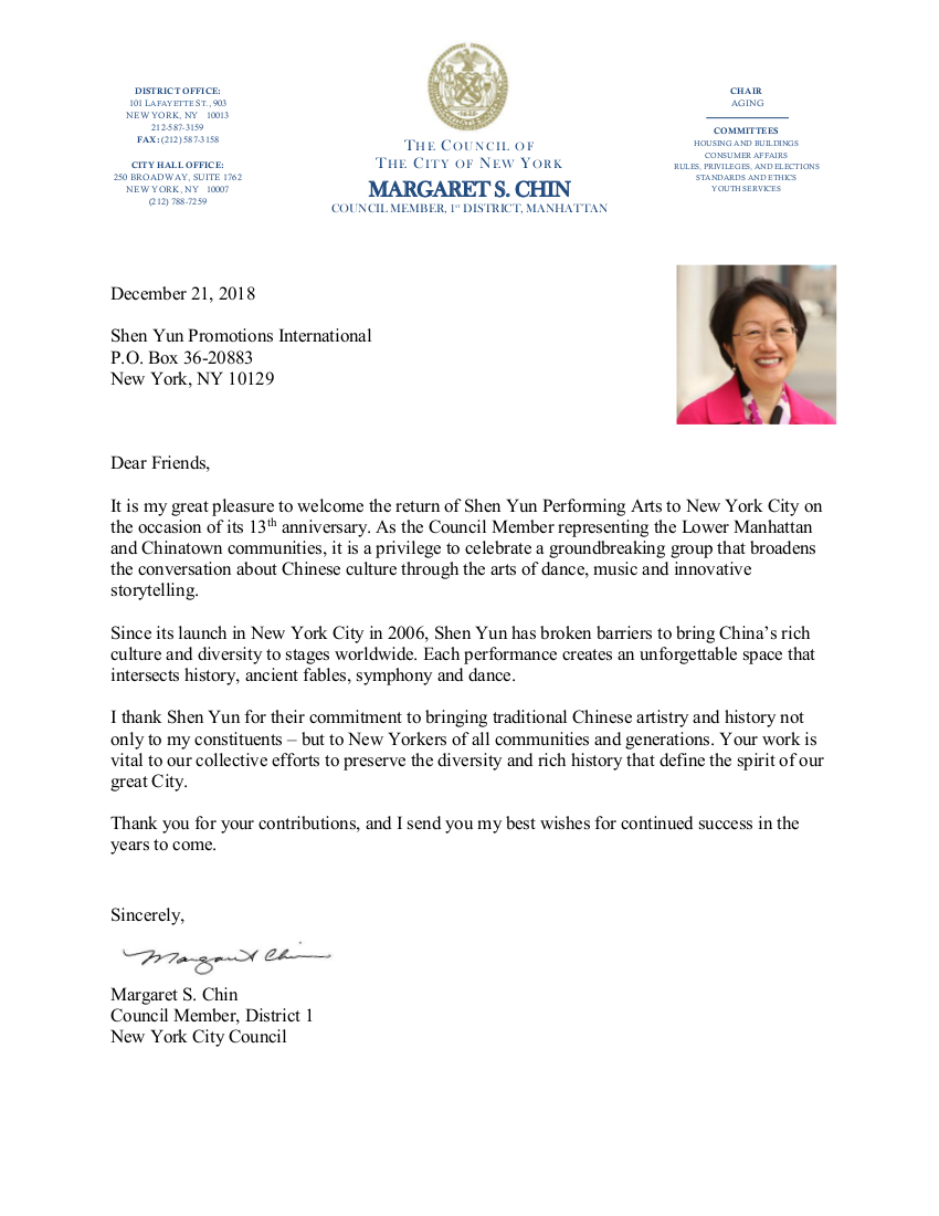 ![]() 图11:华裔纽约市议员陈倩雯(Margaret Chin)给2019神韵演出的贺函。 |