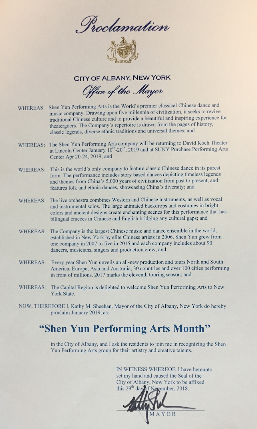 纽约州首府奥本尼(Albany)市长斯涵(Kathy M. Sheehan)发来贺函,并宣布“2019年1月”为该市“神韵艺术月”。