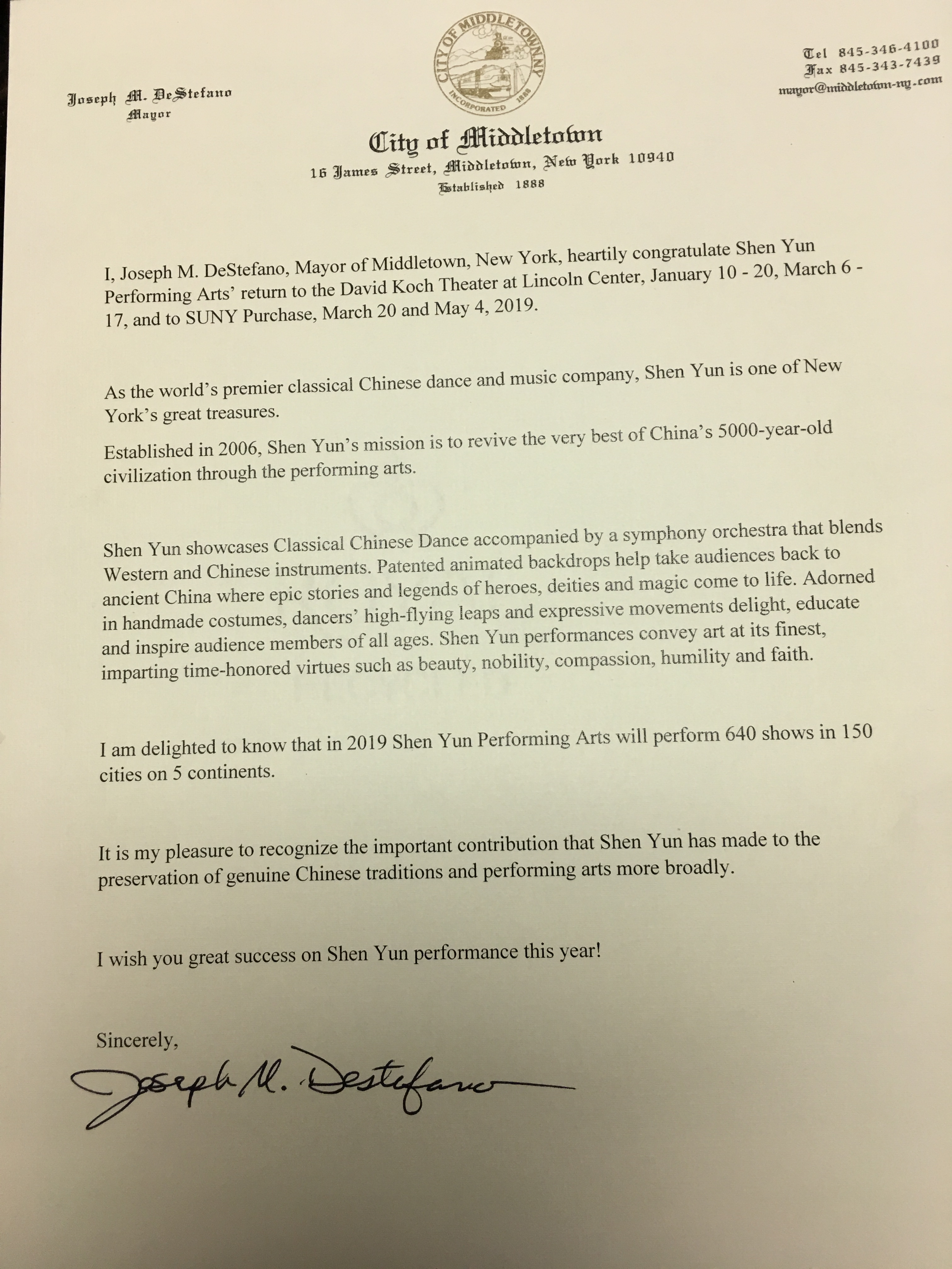 ![]() 图13:米德尔敦(Middle Town)市长斯特法诺(Joseph M. DeStefano)给2019纽约神韵演出的贺函。 |