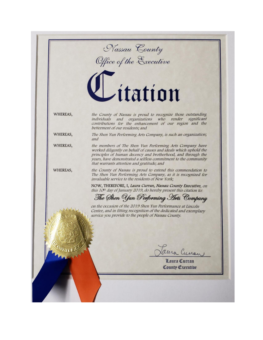 长岛纳苏郡郡长库兰(Laura Curran)发出褒奖,她赞扬“神韵艺术团的成员为维护人类的尊严和友爱而努力工作”。